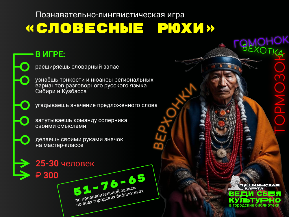 ![]() ![]() ![]() ![]() Словесные рюхиПознавательно-лингвистическая игра, в которой участники узнают, что один и тот же предмет или явление в разных регионах Сибири называется по-разному. И это сейчас не про иностранные слова. Все в рамках великого и могучего русского языка. Такие слова лингвисты называют регионализмами. Участники встречи узнают некоторые тонкости и нюансы региональных вариантов разговорного русского языка Сибири, расширят словарный запас, познакомятся со словами, которые использовались (или используются до сих пор) на территории Сибири и Кузбасса в разные периоды. По ходу лингвистической игры команды не только угадывают значение предложенного слова, но и запутывают своими предположениями команду соперников. Мастер-класс по изготовлению авторских значков со словами-регионализмами станет приятным и памятным дополнением к встрече. Необходимые материалы для мастер-класса предоставляются. Количество участников – 25-30 человек Продолжительность – 1 час Предварительная запись обязательна т. 51-76-65 12+