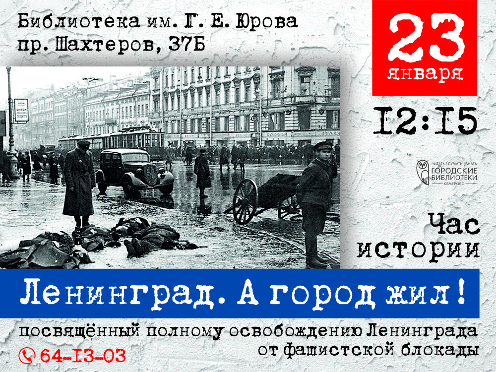 | 14.01 |  | Час истории «Ленинград. А город жил!» в Библиотеке им. Г. Е. Юрова |