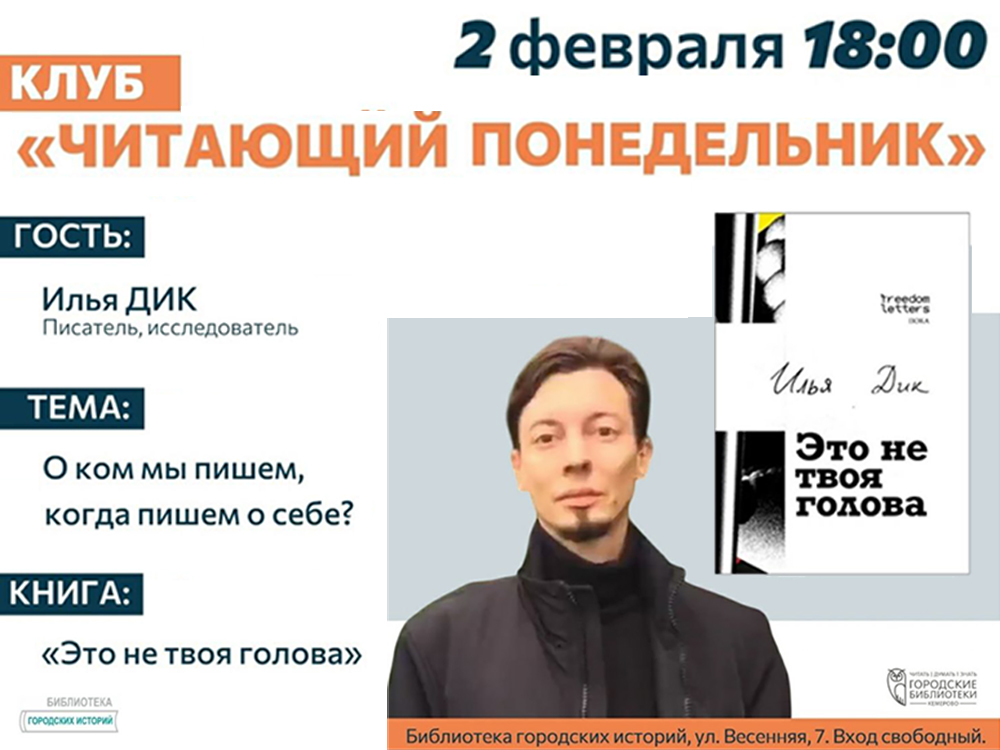 | 02.02 |  | Клуб «Читающий понедельник»: встреча с писателем Ильей Дик в Библиотеке городских историй |