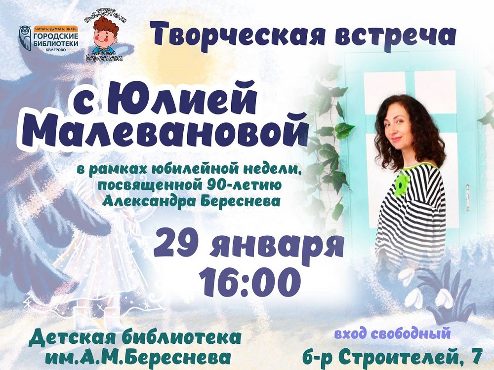 | 20.01 |  | Творческая встреча с писательницей Юлией Малевановой в Детской библиотеке им. А. М. Береснева |