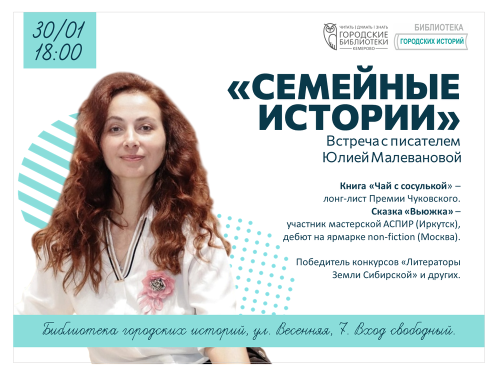 | 26.01 |  | Клуб «Читающий понедельник»: встреча с писателем Юлией Малевановой в Библиотеке городских историй |