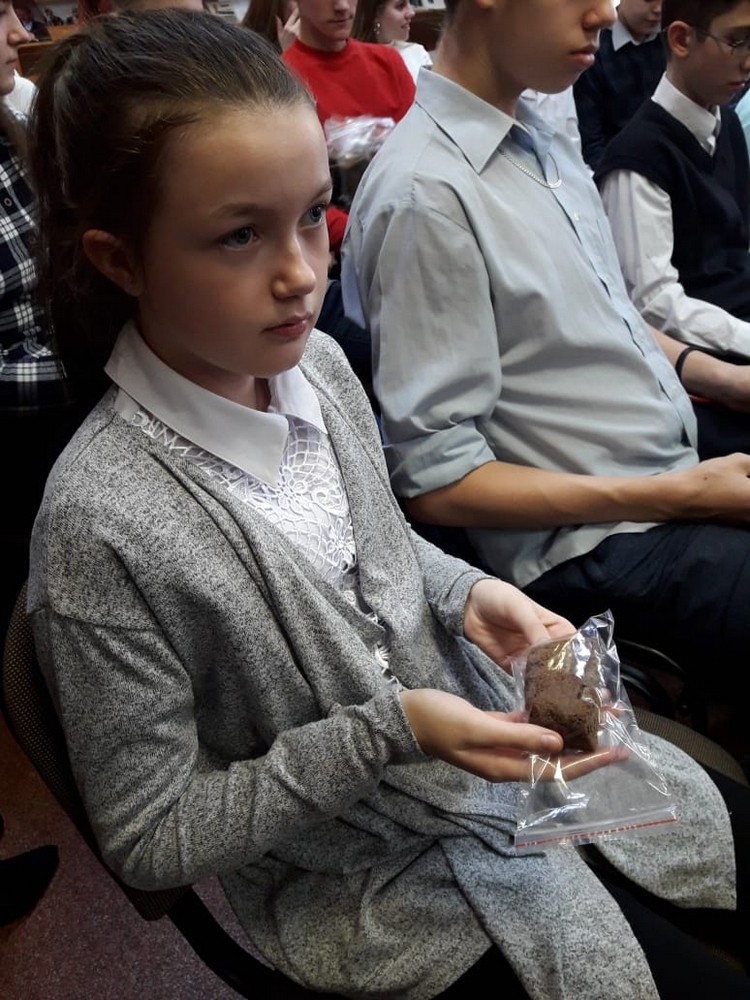 Ребята получили в руки кусочек блокадного хлеба, как напоминание о тех страшных блокадных днях.