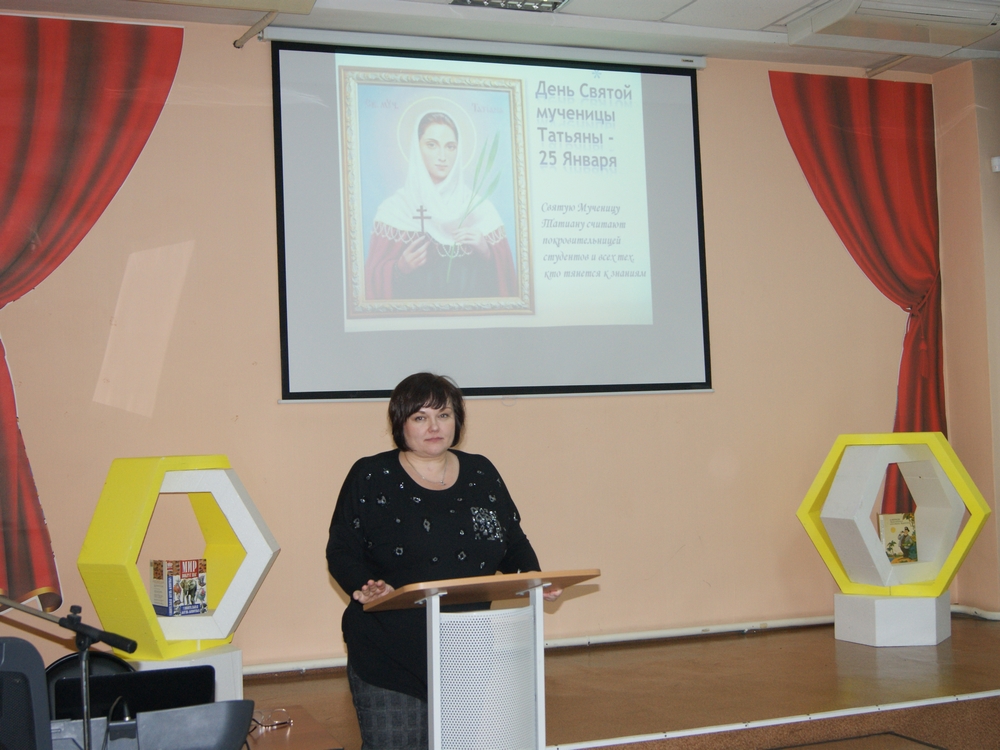 На этой встрече гости библиотеки вспомнили о житие этой святой и о том, что именно в день ее памяти царицей Елизаветой Петровной был подписан указ об основании Московского университета им. М. В. Ломоносова, вследствие чего День российского студенчества и стал носить имя этой святой.