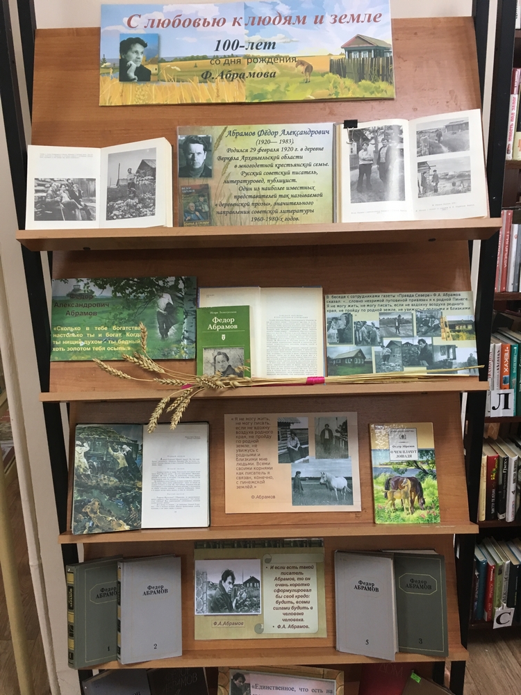 29 февраля 2020 года исполняется 100 лет со дня рождения талантливого русского писателя XX века Фёдора Абрамова – основателя нового направления в советской литературе – «деревенской прозы», автора, всей своей жизнью стремившегося возродить духовное и нравственное начало в человеке. К знаменательной дате с 11 февраля по 26 февраля 2020 года в Библиотеке им. И. М. Киселева (ул. В. Волошиной, 29) открыта выставка-портрет «С любовью к людям и земле». Вам представится уникальная возможность познакомиться с судьбой и творчеством Ф. Абрамова, а также окунуться в литературное наследие писателя, посвященное людям русской деревни, и оценить актуальность произведений в наши дни. Приглашаем всех желающих посетить книжную выставку!