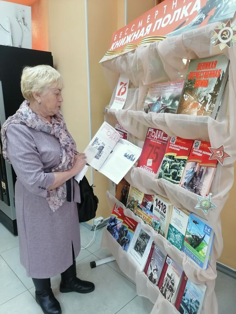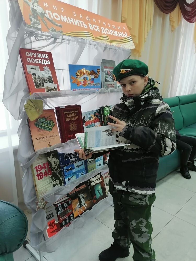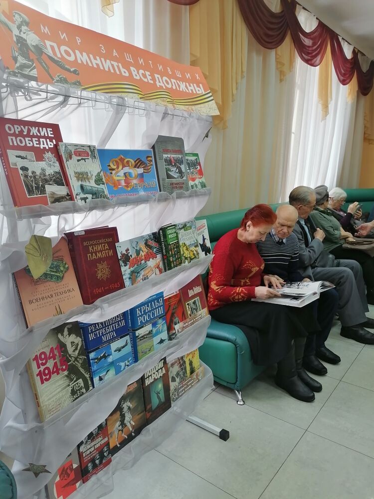 Сотрудники библиотеки в фойе Дворца Культуры оформили две тематические выставки: «Мир защитивших, помнить все должны» и «Бессмертная книжная полка». На выставках была представлена документальная и художественная литература о Великой Отечественной и Афганской войнах, а также издания о военной технике и оружии.