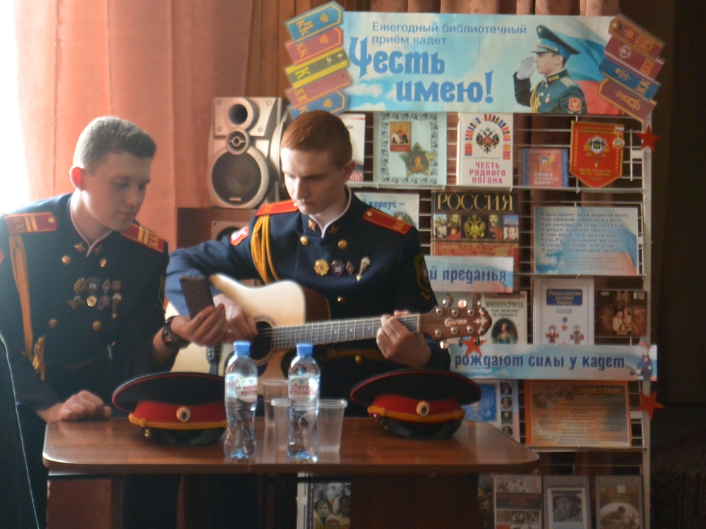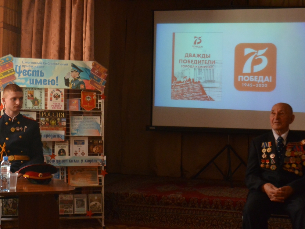 25 февраля 2020 года в Детской библиотеке им. А. М. Береснева (б-р Строителей, 7) состоялся ежегодный библиотечный приём кадет «Честь имею!». Приём был посвящен Году Памяти и Славы, 75-летию Великой Победы и Дню защитника Отечества. На приём были приглашены кадеты ГБ НОУ «Губернаторская кадетская школа-интернат полиции». Зрителями стали учащиеся 7-8 классов школ Ленинского района, участники Российского движения школьников, представители Совета ветеранов Ленинского района. Почётными гостями приёма стали участник Великой Отечественной войны Борис Иванович Корчагин и малолетний узник фашистских лагерей Вера Даниловна Полежаева. В ноябре 2019 года кадетской школе-интернату полиции исполнилось 15 лет. В честь юбилея был показан специальный праздничный ролик, в котором кратко и вместе с тем достаточно подробно рассказывалось о жизни в кадетском корпусе. Диалог зрителей с кадетами прошёл, как всегда, интересно и оживлённо. Как и во все прошлые приёмы зрителей-школьников волновали вопросы, связанные с доступностью в школе интернета, сдачей ЕГЭ, свободным временем у кадет. Кадеты пришли с творческим подарком: кадет 1 курса Андрей Дзик исполнил для зрителей под гитару песню Ю. Шевчука «Это всё…». По традиции на приёме был дан старт акции «Читаем книги о войне». С приветственным словом выступил участник Великой Отечественной войны Борис Иванович Корчагин. Он рассказал о том, какой была именно его война, и дал наставление юному поколению не бояться трудностей, дорожить дружбой и быть честными прежде всего с самими собой. Вера Даниловна Полежаева прочла трогательное стихотворение собственного сочинения о малолетних узниках. Читателям была представлена недавно вышедшая книга памяти «Дважды победители города Кемерово». Книга включила в себя героические биографии почти 1600 наших земляков, прошедших горнило Великой Отечественной войны, вернувшихся с полей боя и в мирное время сделавших всё возможное для восстановления страны, для процветания нашего родного города. В рамках акции «Читаем книги о войне» для зрителей была проведена викторина «Наши деды – славные победы!». Вопросы были посвящены 75-летию Победы в Великой Отечественной войне. В финале викторины победил кадет Георгий Садыков, ответивший на вопрос о главном дикторе Великой Отечественной войны – Юрии Левитане. Георгию досталась энциклопедия «История XIX-XX веков». Завершился приём традиционной фотографией на память. После мероприятия гости прошли по библиотеке с экскурсией. Наши партнёры из «Музея физической культуры и спорта Кузбасса» рассказали им о своей экспозиции «Кузбасскому волейболу – 90!».