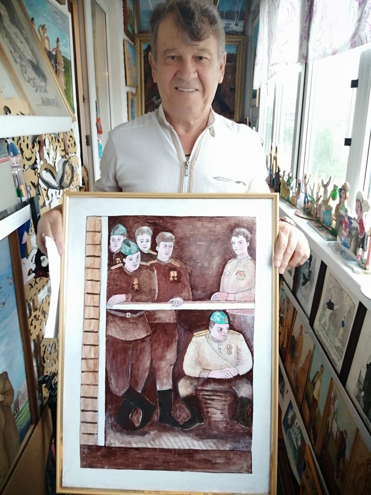 Геннадий Лаврентьевич радушно встретил нас у себя в квартире, заполненной от пола до потолка его работами в различной технике исполнения (изобразительное искусство, выжег, резьба по дереву и прочее).