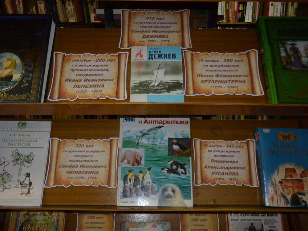В детской библиотеке им. А. М. Береснева (б‑р Строителей, 7) все желающие могут ознакомиться с биографиями и путевыми заметками великих целеустремленных людей прошлых столетий – зарубежных мореплавателей: Ф. Магеллана (540 лет), В. Баренца (470 лет), Г. Гудзона (450 лет), Д. Росса (220 лет) и наших соотечественников: С.Дежнёва (415 лет), С. Челюскина (320 лет), И. Лепёхина (280), И. Крузерштерна (250 лет), В. Русанова (145 лет).