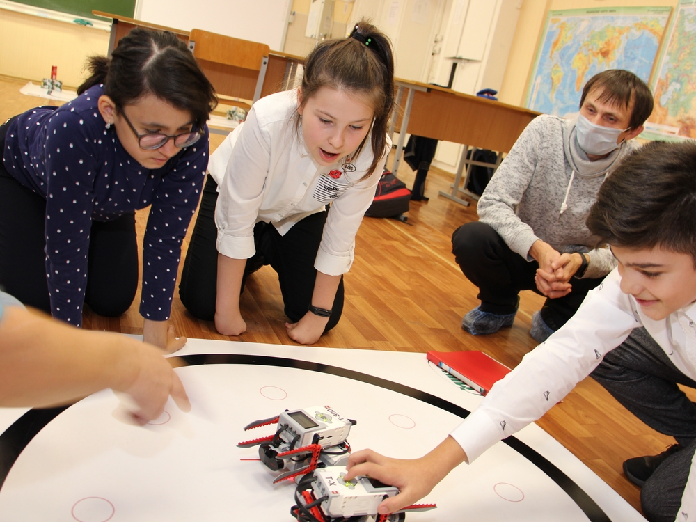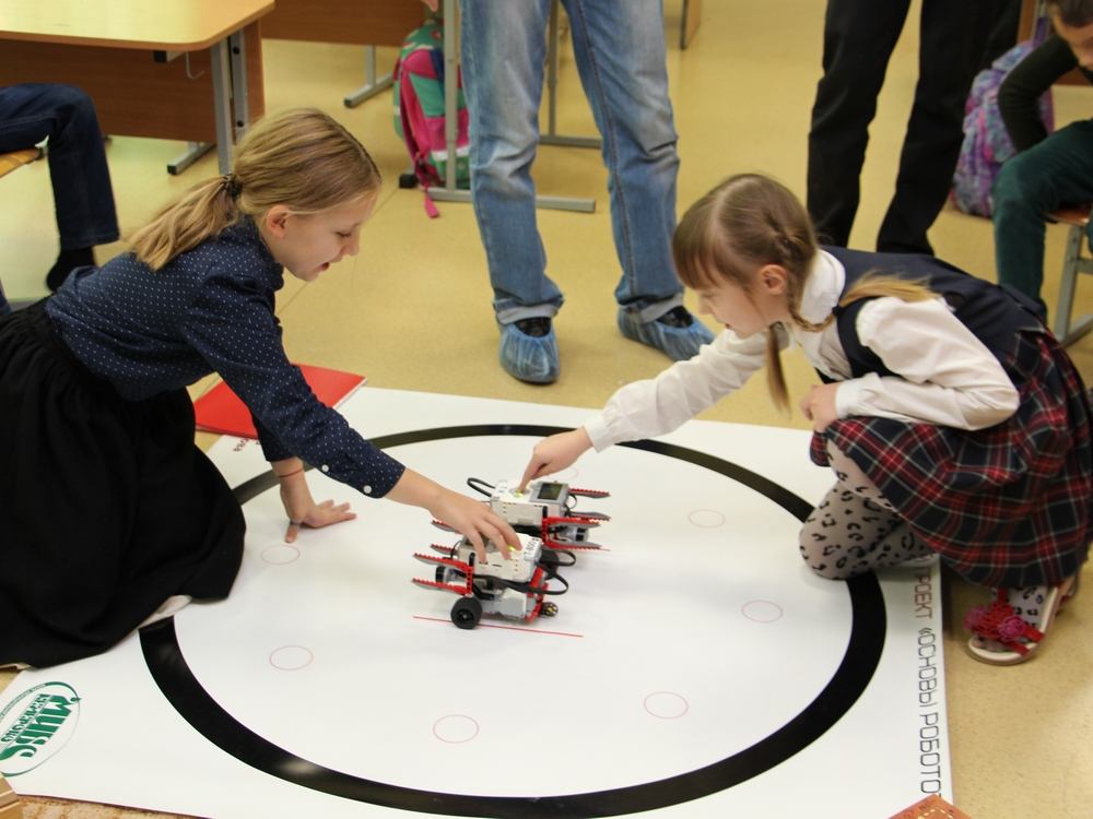 На занятиях, которые проводились на базе АНО «СОШ «Шанс» – партнера Проекта, школьники с 1 по 5 класс проводили сборку роботов из образовательного набора LEGO MINDSTORMS EV3. В процессе конструирования ребята познакомились с работой различных механизмов и датчиков, возможностями заранее собранных роботов. Каждый класс делился на две команды, по ранее разработанным инструкциям проводили сборку робота для участия в состязании «сумо», смысл которого заключался в необходимости вытеснить робота противника за пределы круга. Состязания в каждом классе получились динамичными и напряженными, ребята с восторгом и увлечением «болели» за своих роботов. На следующем занятии их ждет знакомство со средой программирования EV3 и возможностью составить программу для робота самостоятельно.