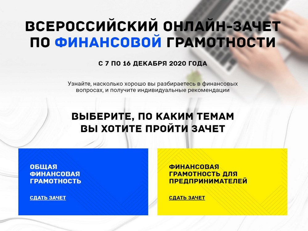 Дорогие читатели! С 7 по 16 декабря 2020 года Центральный Банк Российской Федерации в третий раз проводит Всероссийский онлайн-зачет по финансовой грамотности. Пройти тестирование и узнать свой уровень знаний в области экономики можно на официальном сайте мероприятия https://finzachet.ru/ В этом году зачет разделен на две части. Организаторы предлагают гражданам ответить на вопросы о вкладах, кредитах, страховании. Кроме этого, есть отдельные задания для индивидуальных предпринимателей. При этом можно выбрать уровень сложности: базовый или продвинутый. Участники, правильно ответившие на 20 и более вопросов, станут обладателями именного сертификата. Дополнительно, на основании полученных результатов, каждый участник получит рекомендации, которые позволят восполнить пробелы в знаниях и повысить уровень финансовой грамотности. Время на прохождение – 1 час. Количество попыток не ограничено.