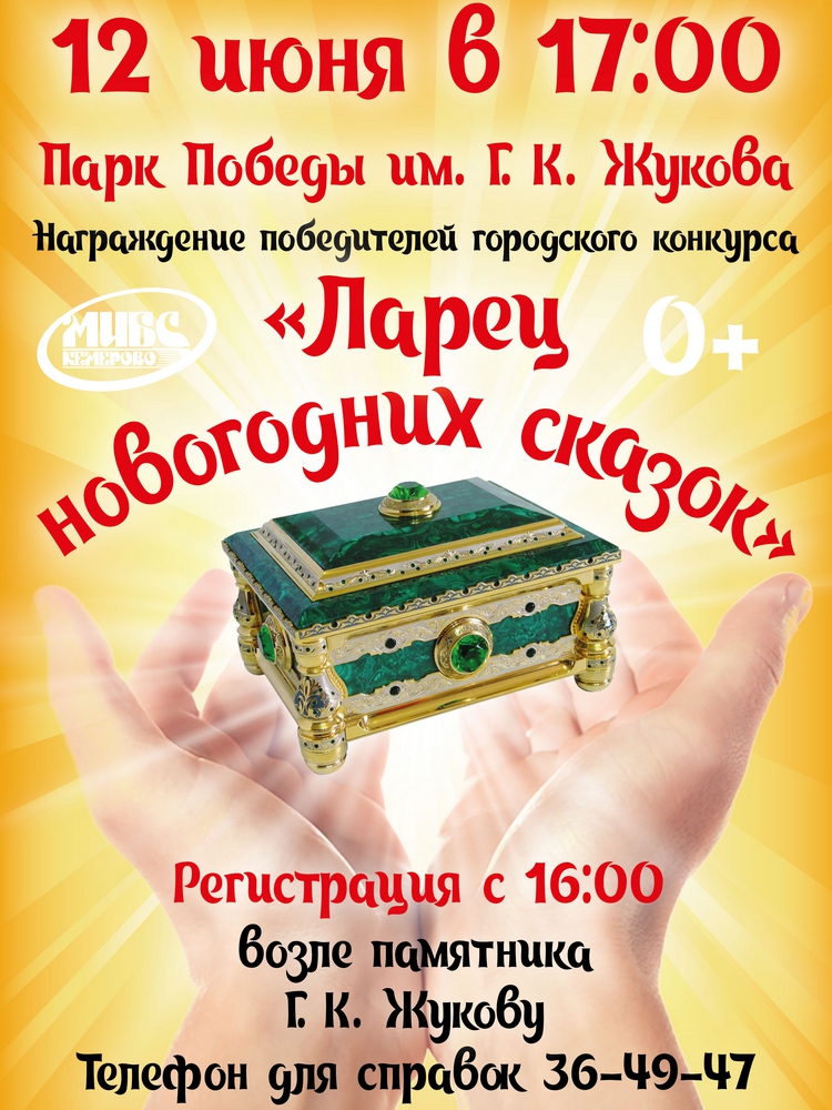 12 июня в 17:00 в Парке Победы им. Г. К. Жукова в рамках праздничных мероприятий, посвященных Дню России и Дню города Кемерово, состоится награждение победителей открытого городского конкурса «Ларец новогодних сказок». Авторы лучших произведений получат дипломы и подарки. Творческие работы победителей конкурса можно прочитать в Сборнике.