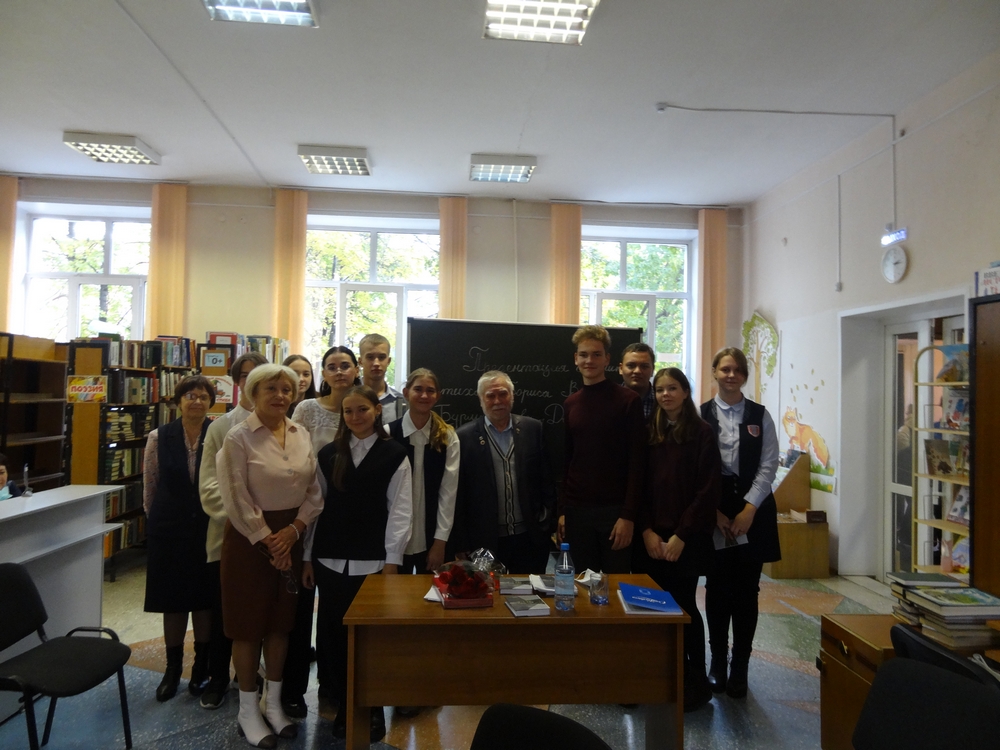 28 сентября в 13:00 в библиотеке им. Г. Е. Юрова (пр. Шахтёров, 37Б) состоялась встреча учащихся 10‑х классов МБОУ «Лицей №89» с поэтом Борисом Васильевичем Бурмистровым.