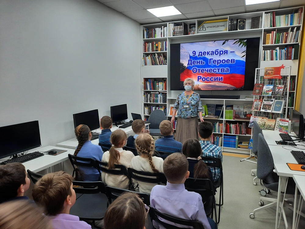 9 декабря Кемеровские библиотеки провели познавательные мероприятия в честь Дня героев Отечества. В этот день граждане России не только отдают дань памяти предкам, но и чествуют ныне живущих Героев Советского Союза, Героев Российской Федерации, кавалеров ордена Святого Георгия и ордена Славы. Ежегодно в Кемеровских библиотеках читатели принимают активное участие в исторических викторинах, лекциях о полководцах и ходят по книжным выставкам. Юные читатели Библиотеки им. В. М. Мазаева (ул. Тухачевского, 12) участвовали в патриотическом квесте «Есть мужество, доступное немногим»: школьники составляли афоризмы известных полководцев, информационный листок с героями Великой Отечественной войны и отвечали на вопросы викторины по историческим военным событиям нашей Родины. В Детской библиотеке им. А. М. Береснева (б-р Строителей, 7) прошёл историко-познавательный мультчас «За службу и храбрость!». Ребятам пришлось провести мозговой штурм, чтобы открыть тайну черного и оранжевого цветов георгиевской ленты. Затем дети познакомились с помощью мультфильма со Святым Егорием – народным образом христианского Святого Великомученика и Победоносца Георгия. Сотрудник Библиотеки на Весенней провела для школьников МБОУ «Школы интернат № 22» (ул. Пролетарская, 20А) патриотический час «Дорогой Афганской войны». Ученики узнали, что участником Афганской войны был и наш земляк – Шорников Николай Анатольевич. За отвагу ему было присвоено звание Героя Советского Союза. Именем Николая Шорникова названа школа в посёлке Кузбасский, которую он закончил, и улица в Кемерово. Библиотека семейного чтения «Книжная радуга» (ул. Новогодняя, 2) представила читателям презентацию об истории праздника. Дети узнали, для чего утвердили орден Святого Георгия при Екатерине II и орден Славы, появившийся в разгар Великой Отечественной войны. Также юные читатели познакомились с патриотической литературой на книжной выставке «Героям Отечества честь и хвала!». Сотрудники детской библиотеки «Островок доброты» рассказали о героях-земляках – участниках Великой Отечественной войны. Ребята узнали о подвиге Михаила Петровича Абызова, который закрыл своим телом амбразуру вражеского дзота. Также дети послушали историю о герое Илларионе Романовиче Васильеве, который в составе 28 панфиловцев участвовал в отражении многочисленных атак противника у разъезда Дубосеково Волоколамского района Московской области.