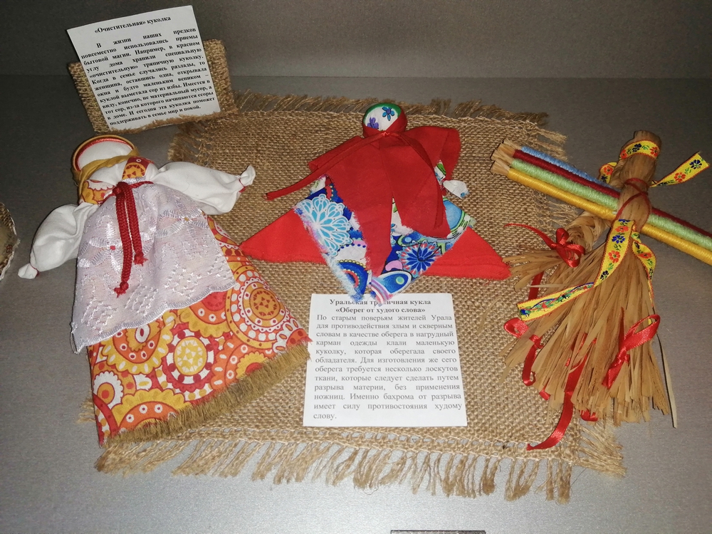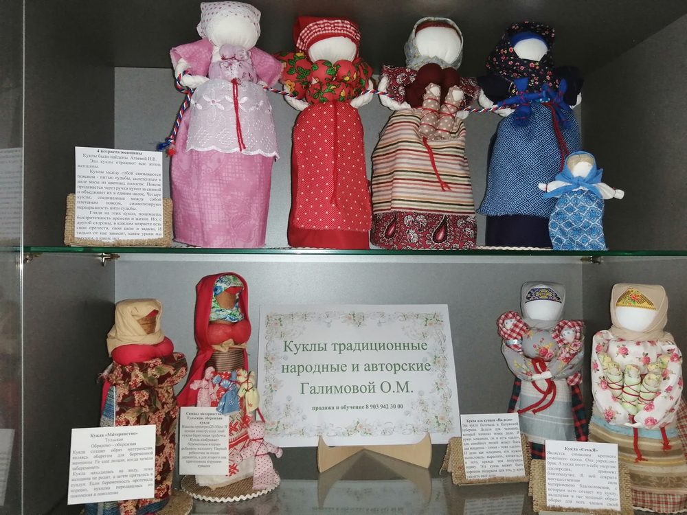 На выставке представлены обережные куклы различных территорий России: кукла «На дело» с пожеланием «прибыли», кукла «СемьЯ», «4 возраста женщины», кукла-оберег материнства. Также на выставке представлены куклы-обереги «Десятиручка», «Женка» и авторские куклы для любования, придуманные самой Ольгой Михайловной Галимовой. Эти куклы традиционно не имеют черт лица.