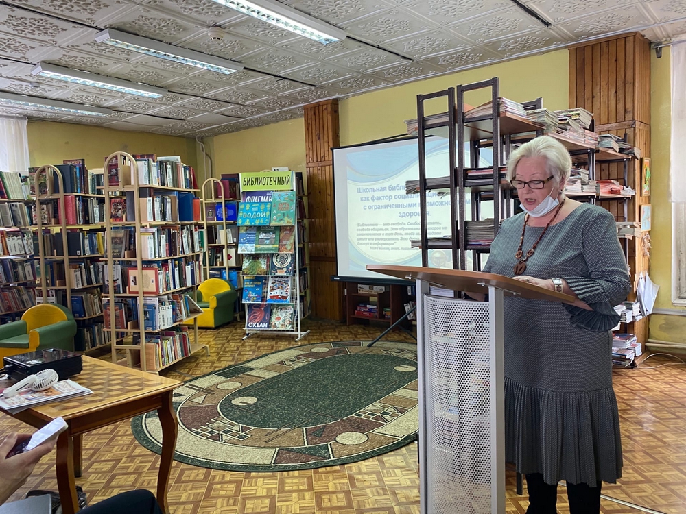 В выступлении заведующей библиотекой общеобразовательной школы психолого-педагогической поддержки № 101 М. А. Жихаревой был сделан акцент на то, что дети с нарушениями развития изолированы в мире себе подобных, что ведет к коммуникативным трудностям, замкнутости. Задача специализированной библиотеки – всеми средствами и прежде всего посредством книги содействовать процессу социальной адаптации детей, имеющих проблемы со здоровьем.