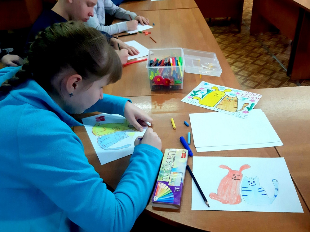 Настоящим сюрпризом этой встречи с художником стал спонтанно организованный мастер-класс. Наметив контуры на чистом листе бумаги, Дмитрий Алексеевич предложил ребятам внести свою лепту в создание рисунка пастельными карандашами «Привет, весна». Несмотря на то, что за окном по-прежнему хмурый февраль, ребятам удалось поднять себе настроение своими яркими и веселыми работами.