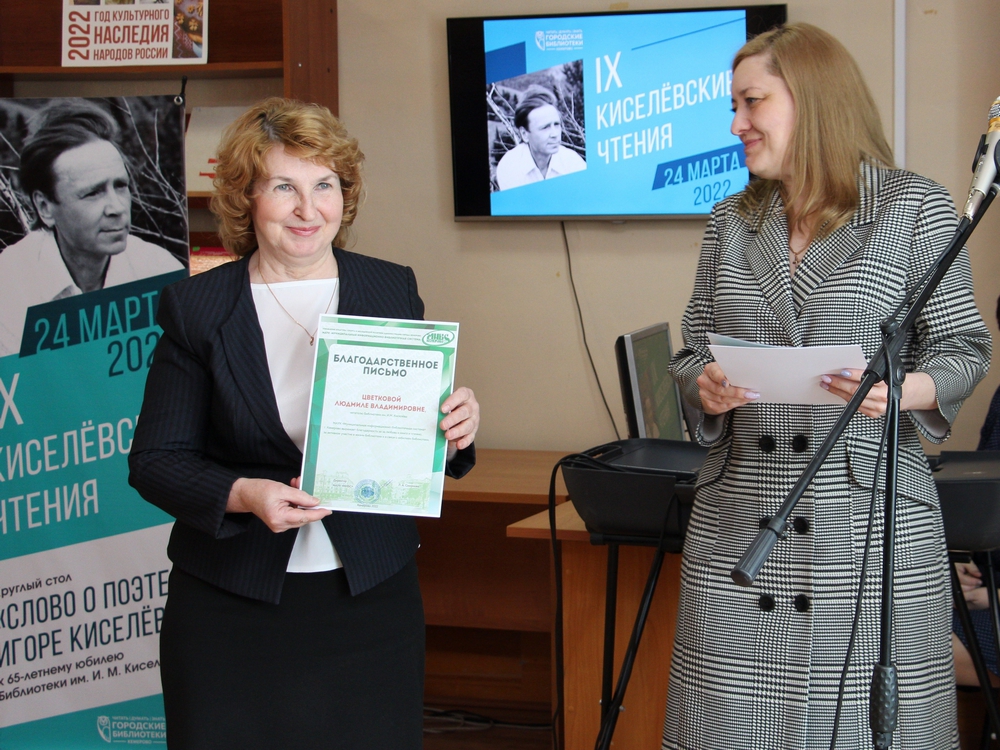 24 марта в Библиотеке им. И. М. Киселёва (ул. В. Волошиной, 29) прошла праздничная программа «Юбилей в кругу друзей», посвященная 65-летию со дня открытия библиотеки. Библиотека начала работу в 1957 году и первые годы носила имя М. Горького. Изначально она находилась на ул. Патриотов, 11 в небольшом помещении, а в 1986 году в новом жилом доме Южного района спроектировали просторное и светлое пространство, в котором библиотека находится и сегодня.В 2004 году библиотеке было присвоено имя кузбасского поэта Игоря Киселёва. Через год открылся музей поэта, здесь же положено начало традиционным Киселёвским чтениям. 65 лет библиотека – настоящий центр чтения, уютный, гостеприимный дом для читателей. Сейчас фонд библиотеки насчитывает более сорока тысяч экземпляров книг. Здесь проходит Ежегодный приём кадет «Честь имею!», много лет работает клуб для пожилых людей «Посиделки», творческая мастерская «Мастерица», литературный клуб-гостиная «Зеленая лампа», кружки «Бодрость», «Дебют», шахматная секция и группа здоровья. Сотрудники библиотеки оформили информационные стенды и выставки, раскрывающие не только книжный фонд, но и историю библиотеки со дня ее основания. Для гостей прошла экскурсия по выставке из фондов Музея-заповедника «Томская Писаница» «Четыре дождя. Поэзия И. Киселёва в контексте работ кузбасских художников». На выставке представлены картины наших земляков, которые удивительным образом переплетаются со стихами Игоря Киселёва. Ознакомиться с экспозицией можно до 15 апреля. Поздравить библиотеку пришли руководители организаций, коллеги, друзья и читатели. С теплыми словами выступила заведующий отделом культуры Управления культуры, спорта и молодежной политики города Кемерово Татьяна Николаевна Гурина. Она вручила сотрудникам библиотеки почетные грамоты и благодарственные письма. Поблагодарил за добросовестный труд и вручил поздравительный адрес сотрудникам депутат Кемеровского городского Совета народных депутатов Александр Александрович Курасов. Директор МАУК «Муниципальной информационно-библиотечной системы» Лилия Александровна Смирнова поздравила работников с юбилейной датой библиотеки и наградила благодарственными письмами. С музыкальными номерами выступили ученики Детской школы искусств № 14. Украшением праздника стало поздравление Совета ветеранов Заводского района г. Кемерово. Добрые слова прозвучали в адрес библиотеки от коллектива Государственного архива Кузбасса, кадет Губернаторской кадетской школы-интерната МЧС, поэтов, членов Союза писателей: Б. В. Бурмистрова, Д. В. Мурзина, Е. И. Тюшиной. Круглый стол «Слово о поэте Игоре Киселёве» собрал почитателей его творчества на IX Киселёвские чтения с праздничным чаепитием, воспоминаниями и чтением стихов. Мы благодарим всех, кто с такой теплотой и вниманием относится к нашей библиотеке! Мы работаем для вас! Пока есть читатели – библиотека будет жить!