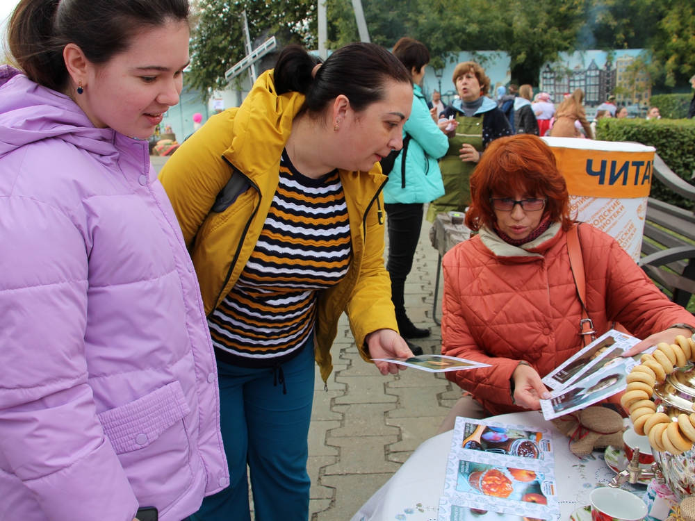 Гости нашей площадки знакомились с книжной выставкой, посвященной приготовлению десертов, а на книжном развале могли взять понравившуюся книгу домой. Николай Иванович Белянин из деревни Белянино Юргинского района выбрал книгу «Супы, борщи и бульоны» и рассказал, что самое любимое его варенье – из лесных ягод, которые в изобилии растут рядом с его деревней. Которую, кстати, основал его прадед Иван Белянин еще в XVIII веке. Гости рассказывали нам, какие самые необычные виды варенья они пробовали – это и варенье из лепестков роз, и из сосновых шишек, и из грецких орехов, и различные ассорти. Тема варенья оказалась неисчерпаемой, как и фантазия тех, кто его варит.