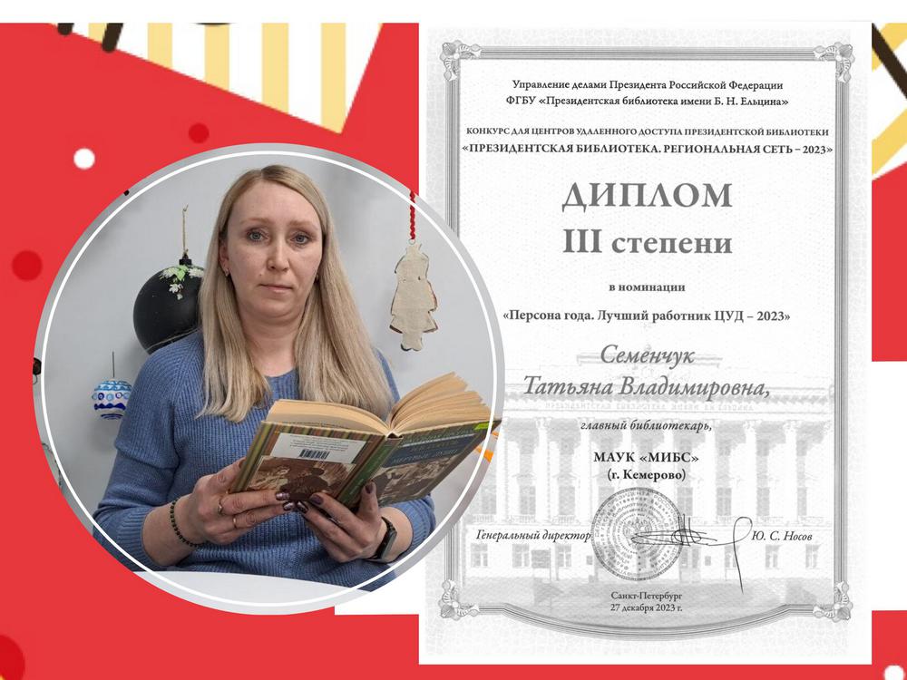 В номинации «Персона года. Лучший работник ЦУД – 2023» диплом 3 степени получила Семенчук Татьяна Владимировна – главный библиотекарь Библиотеки им. Н. В. Гоголя.