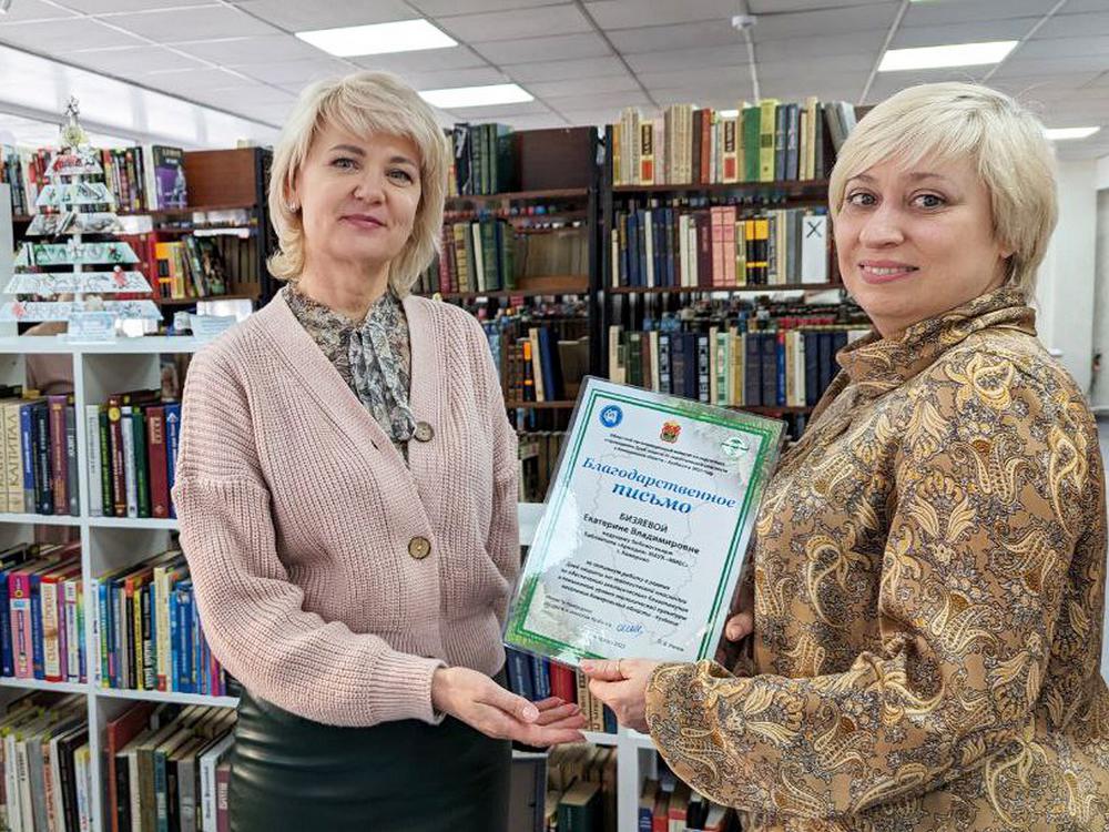 Благодарственные письма за активную работу в рамках Дней защиты от экологической опасности по обеспечению экологического благополучия и повышению уровня экологической культуры населения Кемеровской области – Кузбасса вручили заведующему Библиотекой им. И. М. Киселева Марине Александровне Сирмайс и ведущему библиотекарю Библиотеки «Ариадна» Екатерине Владимировне Бизяевой.