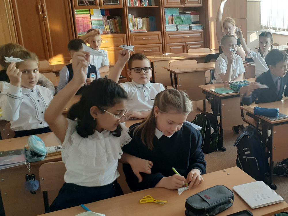 Сюрпризом для школьников стал мастер-класс по изготовлению самолета-истребителя в технике оригами. На самолет в том месте, где должна располагаться кабина пилота дети приклеили портрет Валерия Петровича Чкалова. Самолеты получились очень красивые и аккуратные.