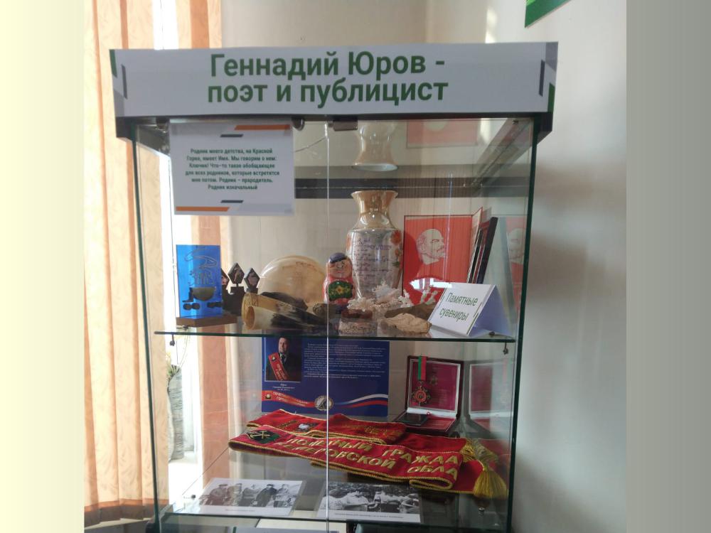 Геннадий Евлампиевич – кузбасский поэт, прозаик, публицист, Почетный гражданин г. Кемерово и Кемеровской области, автор слов гимна Кузбасса. В мае 2019 г. его имя присвоено библиотеке в Рудничном районе. Тогда же здесь была организована экспозиция, посвященная жизни и творчеству писателя. Посетители библиотеки могут увидеть копии архивных документов поэта и его родителей, семейные фотографии, фото в кругу друзей, различные сувениры, некоторые награды, печатную машинку писателя. И конечно же, познакомиться с произведениями Геннадия Юрова. А с помощью куар-кодов со ссылками на аудиогид можно узнать дополнительную информацию об экспонатах.
