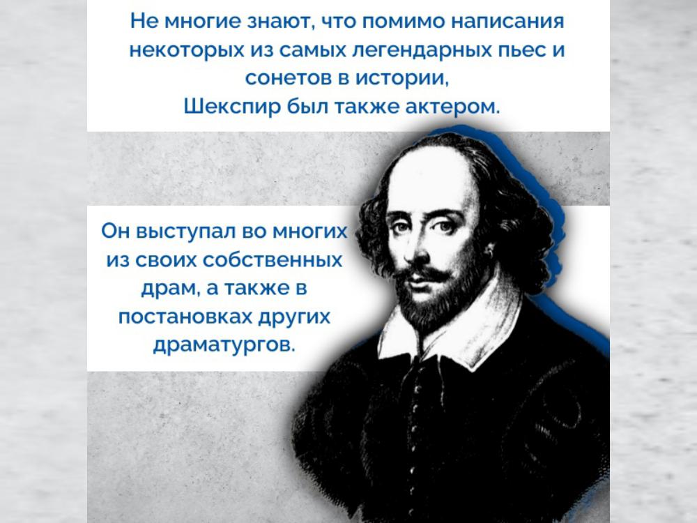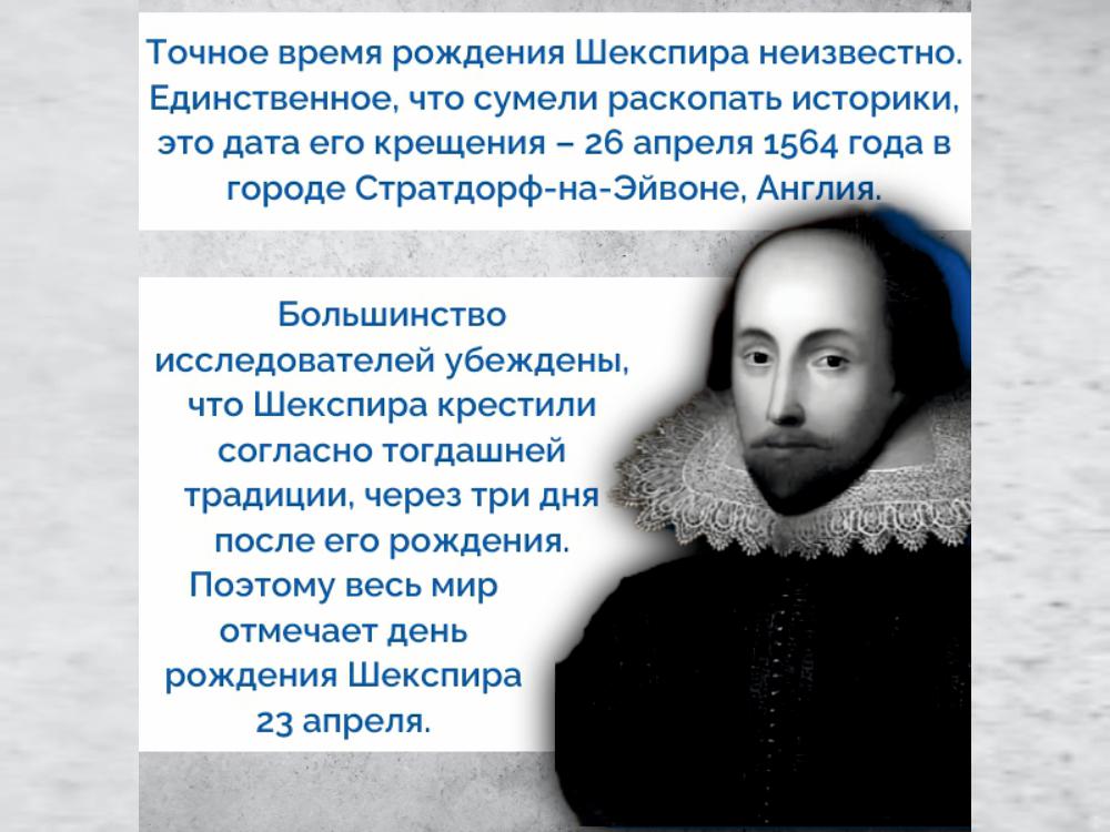 23 апреля исполняется 460 лет со дня рождения Уильяма Шекспира величайшего английского драматурга и поэта, автора более 200 всемирно известных произведений. Он – автор многочисленных пьес, поэм, сонетов: «Гамлет», «Отелло», «Король Лир», «Макбет» «Двенадцатая ночь», «Ромео и Джульетта» и многих других. Его произведения переведены и изданы практически на всех языках. Литературное творчество можно условно разделить на четыре периода: комедии и поэмы, романтические произведения, глубокие философские книги. Последние работы характеризуются отточенным слогом и изящным поэтическим мастерством. Шекспир оказал огромное влияние на развитие театрального искусства. Спектакли по его пьесам остаются актуальными даже спустя несколько веков после их создания. Талант вызывать одинаковое восхищение и у искушенного эстета, и у простого обывателя – вот, пожалуй, то, что делает его настоящим гением. Приходите в библиотеку «Ариадна», где вы узнаете ещё много нового и интересного.
