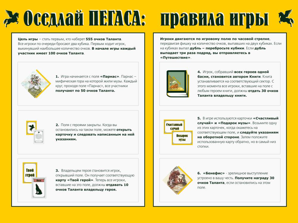Дорогие друзья, прекрасная новость! Городские библиотеки вновь спешат порадовать любителей настолок. Всем почитателям стратегических игр посвящается наша новинка по мотивам басен Ивана Крылова «Оседлай Пегаса». Кто обойдет конкурентов и станет самым талантливым писателем – зависит только от вас. Придумать нового героя и дописать книгу? Или отдать последние очки таланта за то, что украл чужую идею? Проверьте, на чьей стороне удача! Наша игра – прекрасный повод провести время с семьей и друзьями. Весело и интересно будет всем. В игре есть известные всем герои басен, крылатые выражения и только самые интересные факты об Иване Крылове. Как играть? Всё просто! Бросайте кубик и двигайтесь по игровому полю. Открывайте новых героев, получайте подарки Музы, радуйтесь счастливому случаю. И не забывайте пересчитывать свою игровую валюту, ведь победит тот, кто первым наберет 555 очков таланта. Дерзайте!