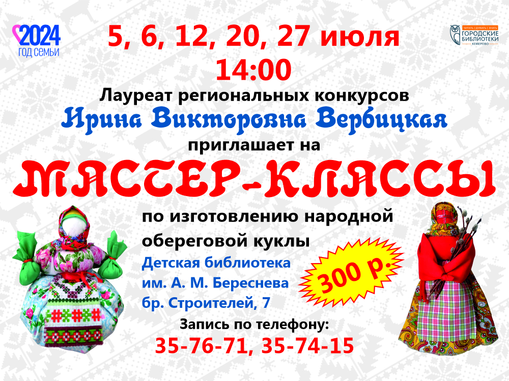 Ирина Викторовна приглашает горожан на свои мастер-классы 5, 6, 12, 20, 27 июля в 14:00, где появится возможность из предоставленных материалов изготовить народную куклу. Цена 300 руб.