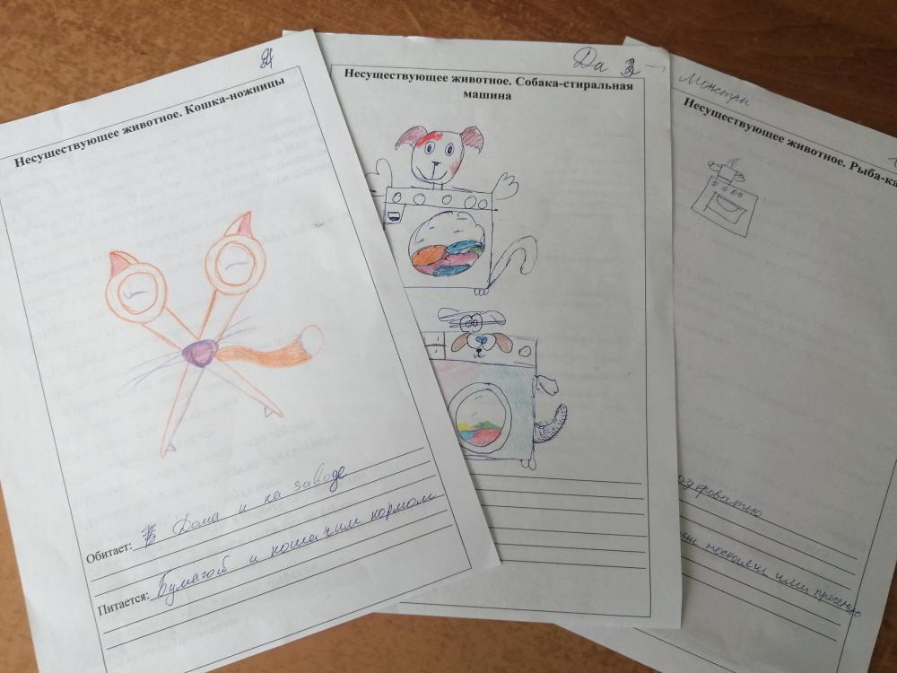 - В конкурсе «Несуществующее животное» они изобразили кошку-ножницы, Собаку-стиральную машину и рыбу-кастрюлю, пояснив где она живет и чем питается.