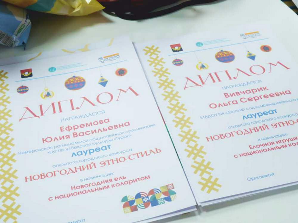 Сегодня, 24 декабря 2024 года в Кемерово в Библиотеке им. Н. В. Гоголя прошло торжественное награждение победителей открытого городского конкурса «Новогодний этно-стиль». На конкурс было прислано 113 уникальных работ, каждая из которых отражала самобытные новогодние традиции различных народов. Победителей награждала Татьяна Николаевна Гурина, заведующий отделом культуры Управления культуры, спорта и молодёжной политики города Кемерово. В своём обращении она подчеркнула, что каждая из представленных работ – это настоящее произведение искусства, и отметила главную цель конкурса: сохранение традиций и обычаев многонациональной культуры нашего региона. Победители в номинации «Новогодняя ель с национальным колоритом»: - 1 место – Штейнмиллер Виктория Ильинична, МБОУ «Лицей №23»