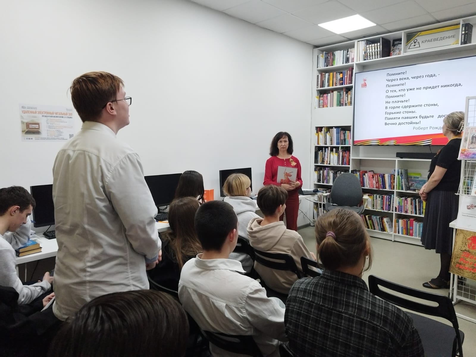 11 марта 2025 г. в библиотеке «Книжная радуга» прошел урок-экскурсия «Знаем героев» для старшеклассников школы №96. Учащиеся познакомились с памятниками жилого района Кедровка: «Парк Победы», «Мемориал погибшим в годы Великой Отечественной войны», «Аллея ветеранов», узнали о Почетных кедровчанах-участниках Великой Отечественной войны и о Герое Советского Союза Брюханове Степане Степановиче, в честь которого названа улица в жилом районе Кедровка. Для закрепления материала, ребята приняли участие в игре «Сапер», где в матрице были зашифрованы фамилии кедровчан – ветеранов Великой Отечественной войны. В задании «Граната», воспользовавшись шифром Цезаря, школьники рассекречивали названия памятных мест Кедровки.