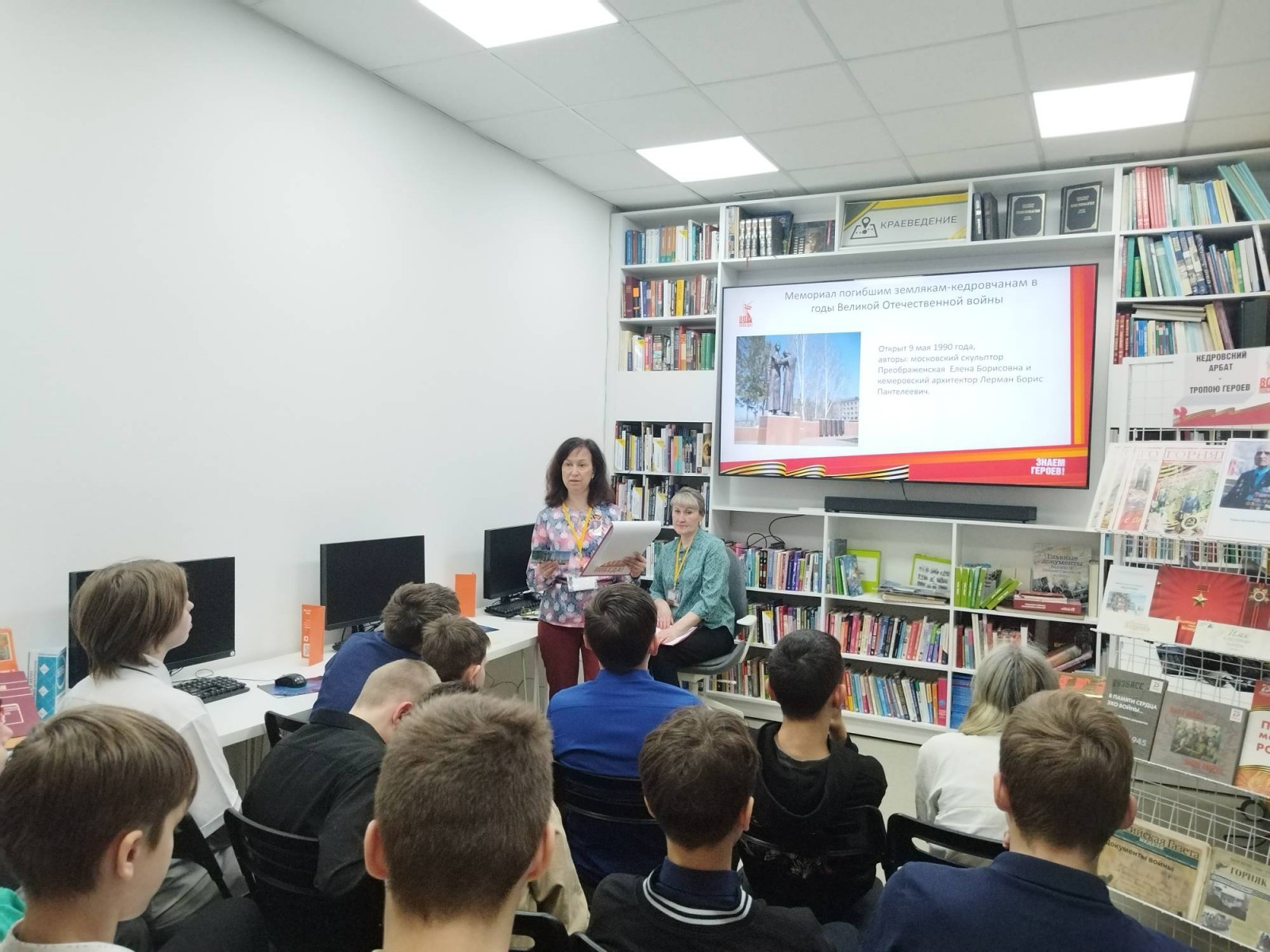 24 апреля сотрудники библиотеки «Книжная радуга» продолжают знакомить юное поколение в рамках проекта «Знаем героев» с достопримечательностями и памятниками жилого района Кедровка, среди которых «Парк Победы», мемориал погибшим землякам-кедровчанам в годы Великой Отечественной войны и аллея ветеранов. Сегодня, учащиеся старших классов школы №70 узнали о Почетных кедровчанах-участниках Великой Отечественной войны и о Герое Советского Союза Брюханове Степане Степановиче, в честь которого названа улица в жилом районе Кедровка. Во время занятия ребята приняли активное участие в увлекательной интеллектуальной игре «Сапер», где разгадывали зашифрованные в матрице фамилии ветеранов Великой Отечественной войны из Кедровки. В другом задании, получившем название «Граната», используя шифр Цезаря, участники успешно дешифровали названия памятных мест Кедровки. Завершился этот яркий день просмотром документального фильма «Кемерово в годы Великой Отечественной войны».