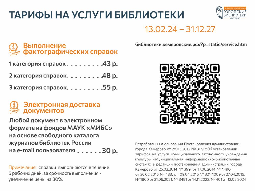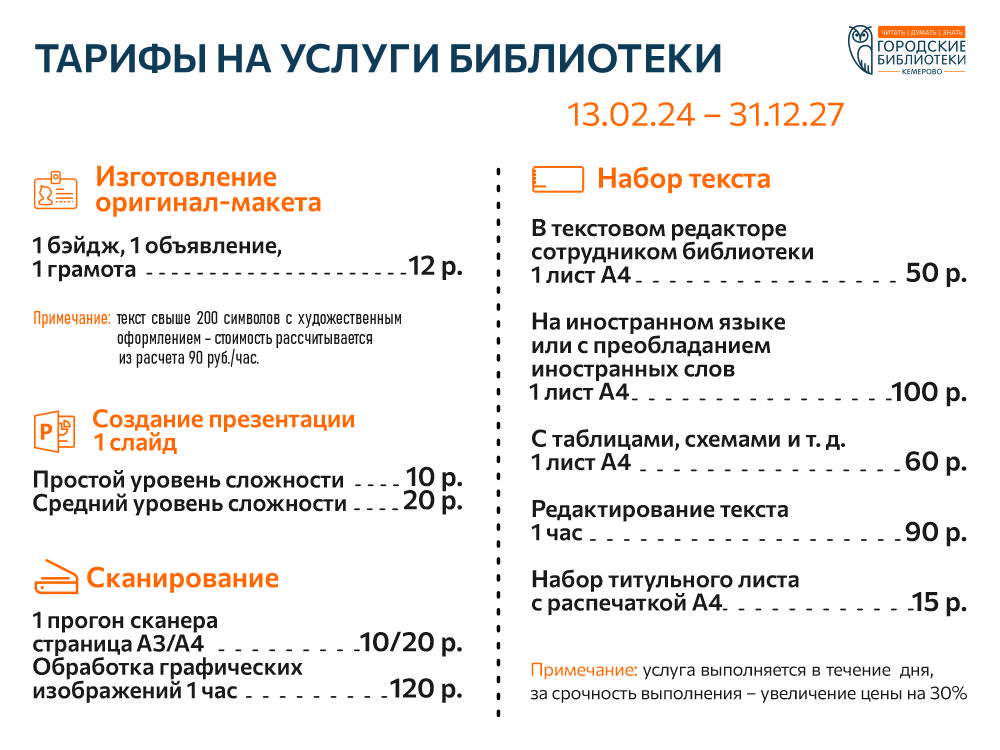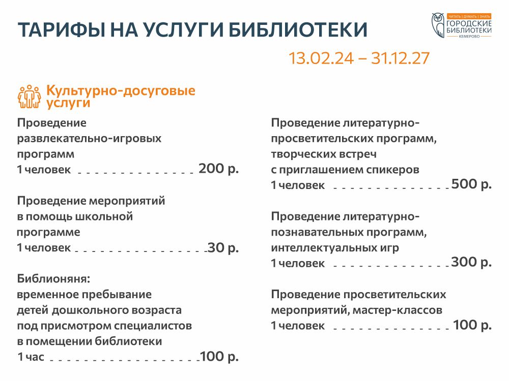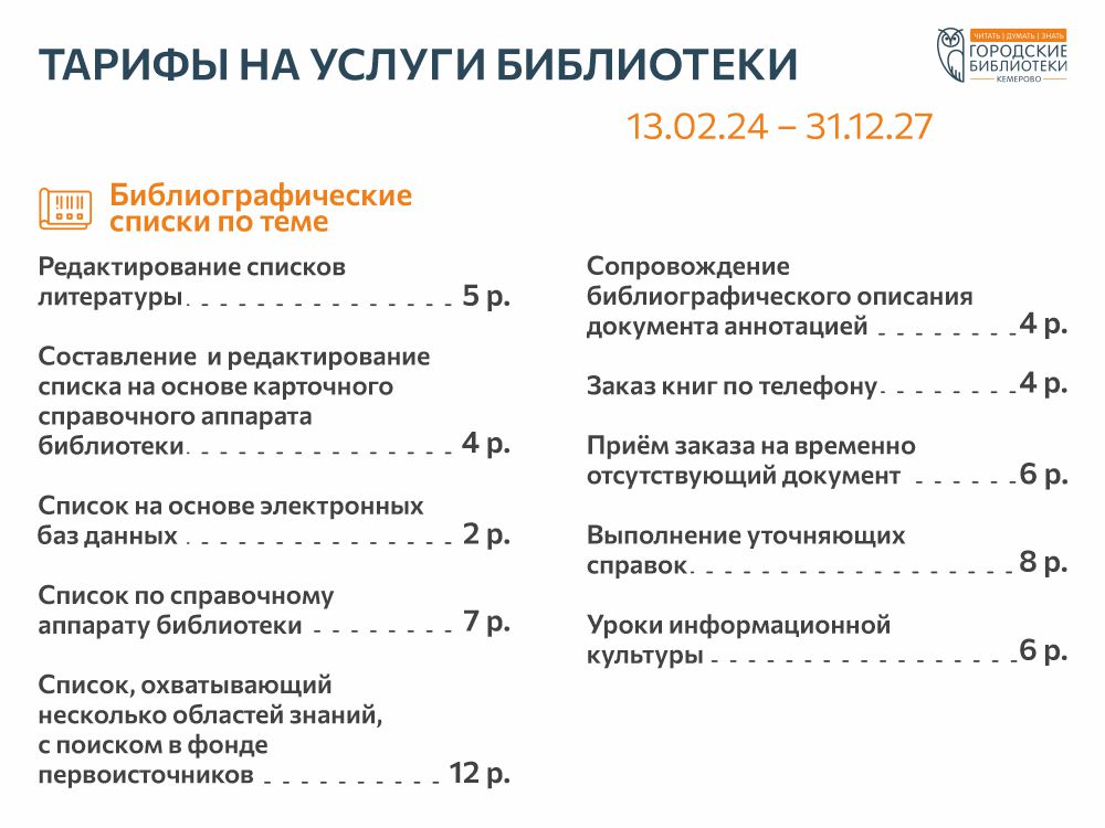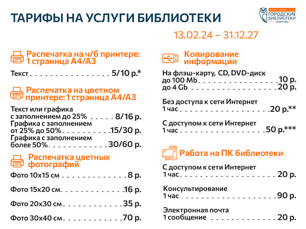 Городские библиотеки Кемерово: больше, чем просто книги! Наши библиотеки – это не только огромный выбор книг и электронных ресурсов, но и широкий спектр полезных сервисных услуг! У нас вы можете: - воспользоваться современной техникой: компьютеры, принтеры, сканеры – все для вашей учебы и работы; - получить помощь в подготовке документов: наши специалисты помогут вам составить резюме, написать заявление или оформить презентацию; - заказать нужную книгу: мы найдем и доставим для вас любое издание; - научиться пользоваться компьютером и интернетом: посетите наши уроки информационной культуры и станьте уверенным пользователем! Все услуги предоставляются по доступным ценам! Тарифы действуют с 13 февраля 2024 года по 31 декабря 2027 года Приходите и убедитесь сами! Наши библиотеки есть в каждом районе.