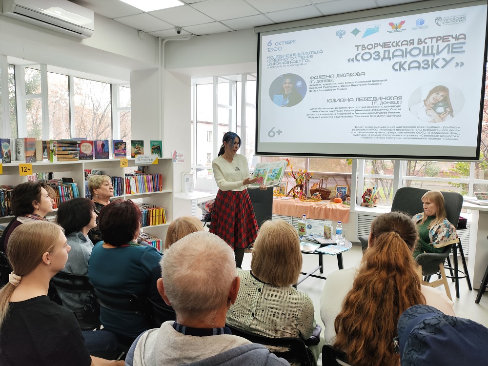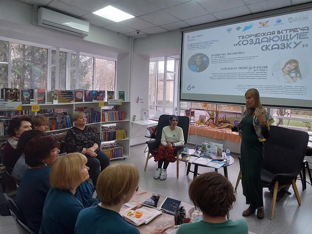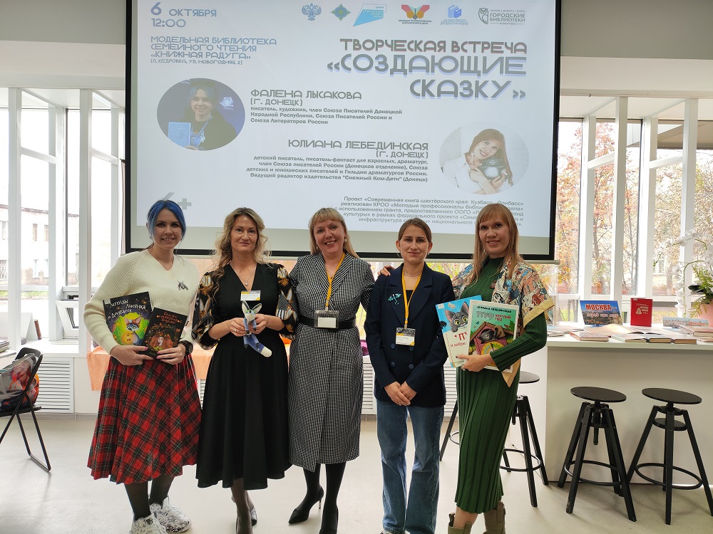 6 октября в модельной библиотеке семейного чтения «Книжная радуга» (ж.р. Кедровка, ул. Новогодняя, 2) состоялась творческая встреча «Создающие сказку» с писателями из Донецка. Мероприятие прошло в теплой и искренней атмосфере и стало для кедровчан значимым культурным событием. Гостями и главными героинями вечера стали две талантливые писательницы из Донецка: Юлиана Лебединская – детский писатель, фантаст, драматург. Член Союза писателей России и Гильдии драматургов. Редактор издательства «Снежный Ком-Дети» (Донецк). Автор 7 книг и публикаций в сборниках. Волонтер. Фалена Лысакова – писатель и художник-иллюстратор, член Союза писателей ДНР, Союза писателей России и Союза литераторов России. Автор и иллюстратор популярной серии книг о Лисёнке. В 2018 году проиллюстрировала «Азбуку Донбасса», которая сегодня есть у каждого первоклассника ДНР. Теплая, почти сказочная атмосфера, созданная за окном падающим снегом, способствовала полному погружению гостей в мир литературы. Читатели с большим интересом слушали рассказы писательниц о процессе создания литературных персонажей, тонкостях иллюстрирования произведений и истории появления их героев. Юлиана Лебединская и Фалена Лысакова продемонстрировали прекрасный творческий тандем. Гости узнали, что авторы не только гармонично дополняют друг друга в общении, но и тесно сотрудничают в работе — Фалена проиллюстрировала несколько рассказов Юлианы. Писательницы также поделились опытом совместной деятельности в проведении познавательных квестов для школьников. По завершении официальной части самые активные участники встречи получили от авторов памятные сувениры — авторские открытки. Все желающие смогли поделиться своими впечатлениями, оставив письменные отзывы на специальных бланках. Коллектив библиотеки «Книжная радуга» выражает глубокую благодарность Юлиане и Фалене за тёплую и содержательную встречу и надеется на дальнейшее сотрудничество. Встреча прошла в рамках проекта «Современная книга шахтёрского края: Кузбасс - Донбасс», который реализуется КРОО «Молодые профессионалы библиотечного дела» с использованием гранта, предоставленного ООГО «Российский фонд культуры» в рамках федерального проекта «Семейные ценности и инфраструктура культуры» национального проекта «Семья». Генеральный партнер: ГАУК «Государственная библиотека Кузбасса для детей и молодёжи». Проект реализуется при поддержке: МАУК «Муниципальная информационно-библиотечная система» г. Кемерово.