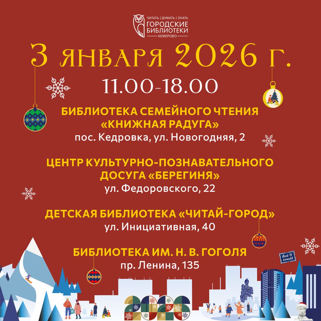 В праздничные дни городские библиотеки ждут своих читателей. Мы публикуем график работы на выходные, чтобы вам было удобнее планировать визит. Обратите внимание: библиотеки будут работать с 11:00 до 18:00. Приходите за книгами и праздничным настроением! 03.01.2026 г. 11.00-18.00. - Библиотека им. Н. В. Гоголя (пр-т Ленина 135).