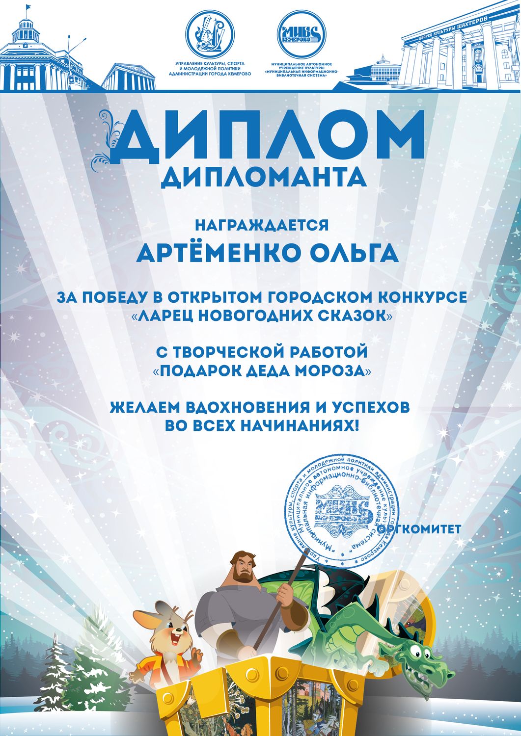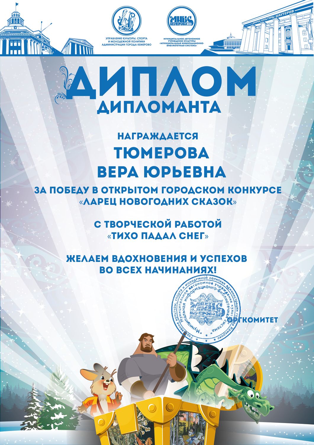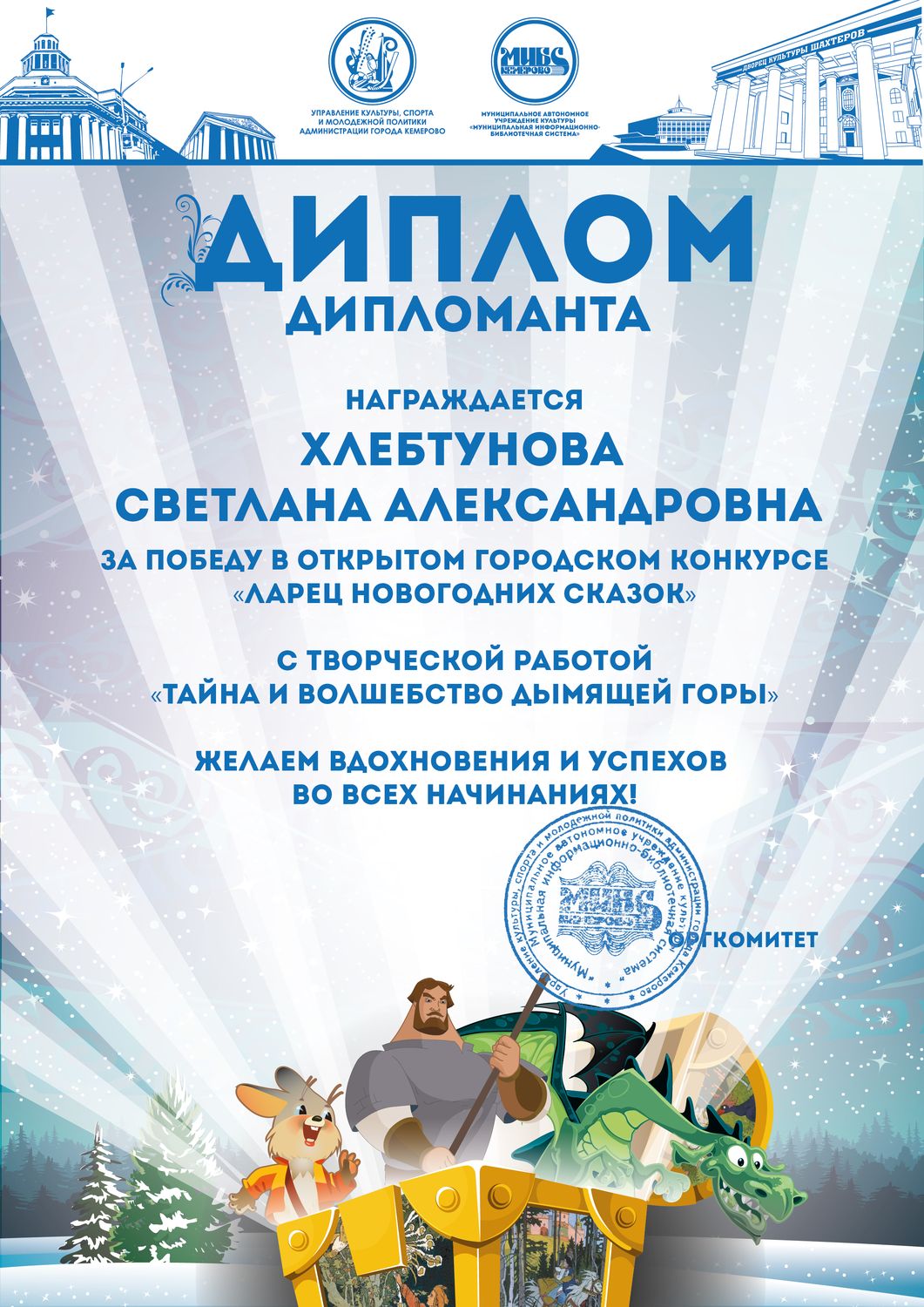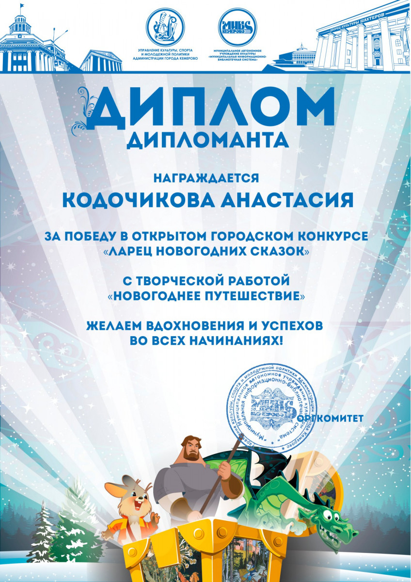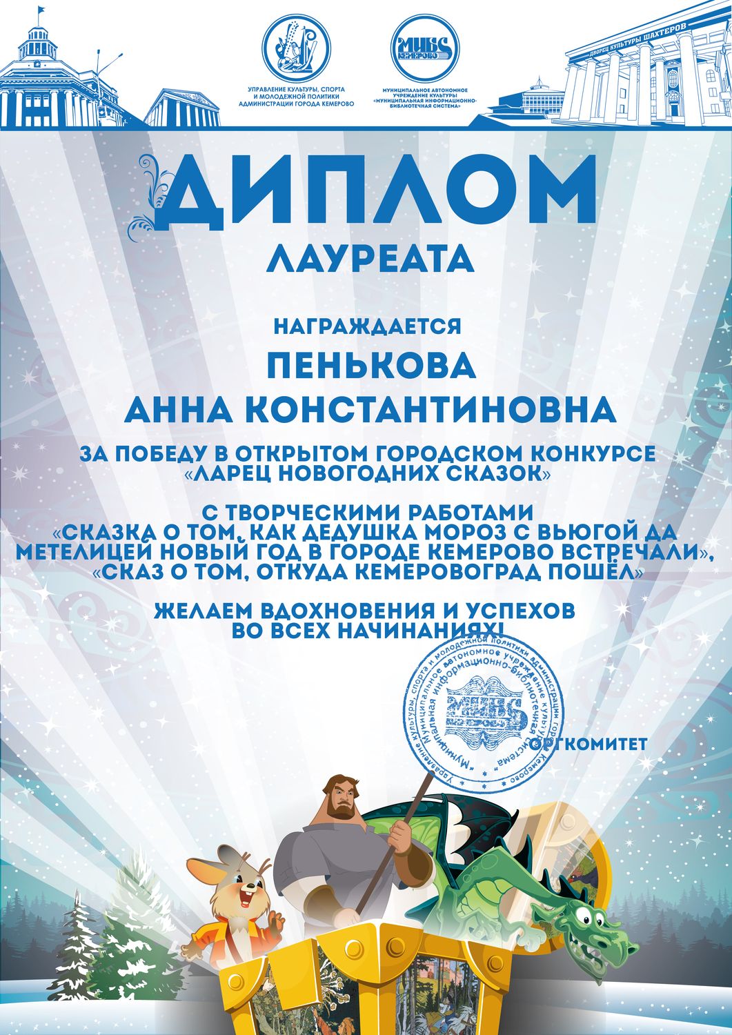 Пенькова Анна Константиновна, творческая работа «Сказ о том, откуда Кемеровоград пошел», «Сказка о том, как Дедушка Мороз с Вьюгой да Метелицей Новый год в городе Кемерове встречали»