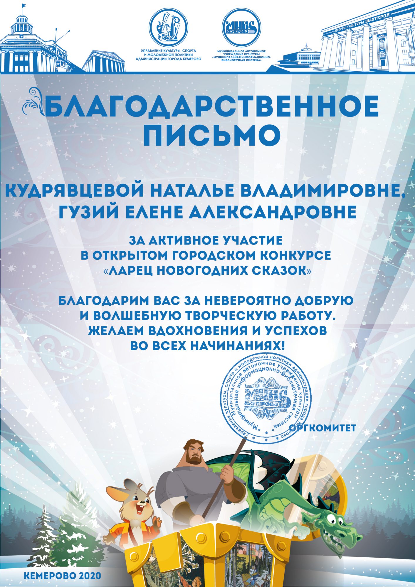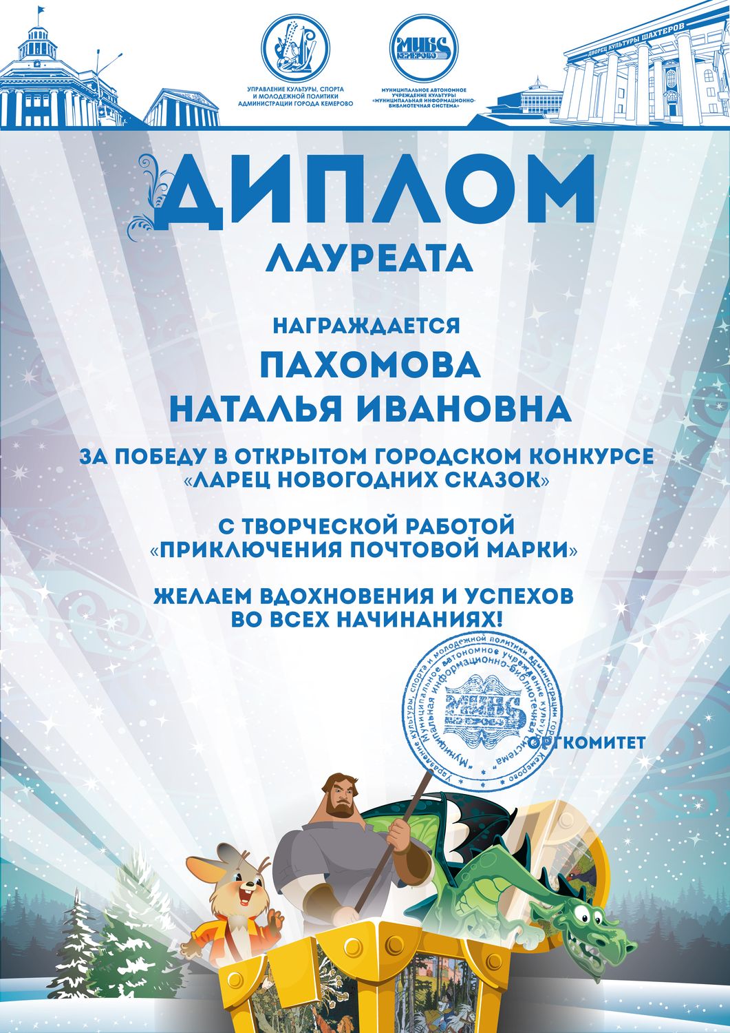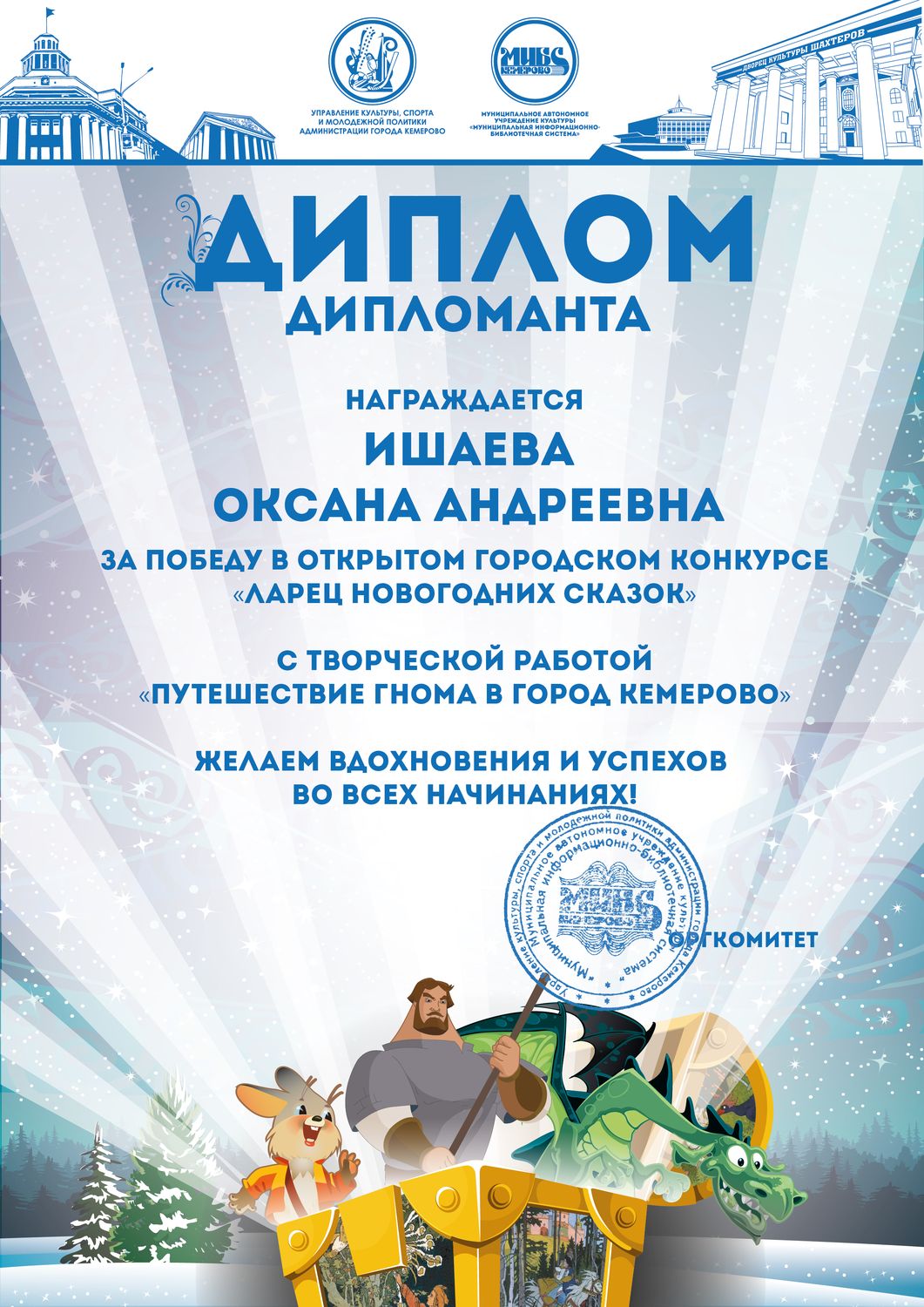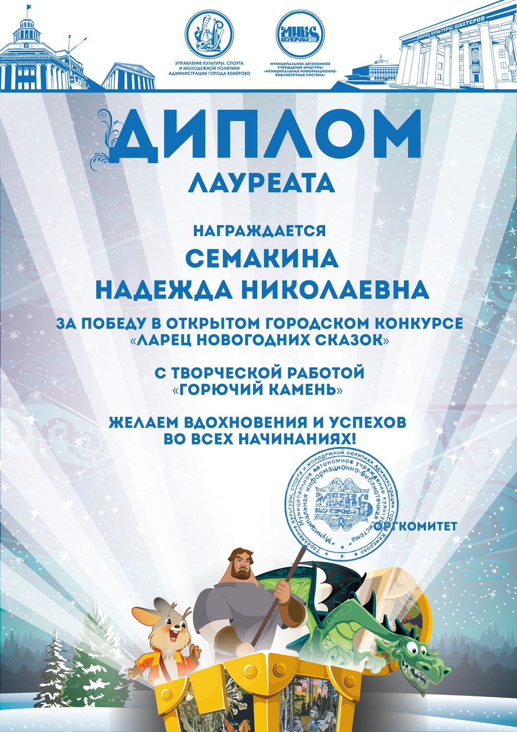 Пенькова Анна Константиновна, творческая работа «Сказ о том, откуда Кемеровоград пошел», «Сказка о том, как Дедушка Мороз с Вьюгой да Метелицей Новый год в городе Кемерове встречали»