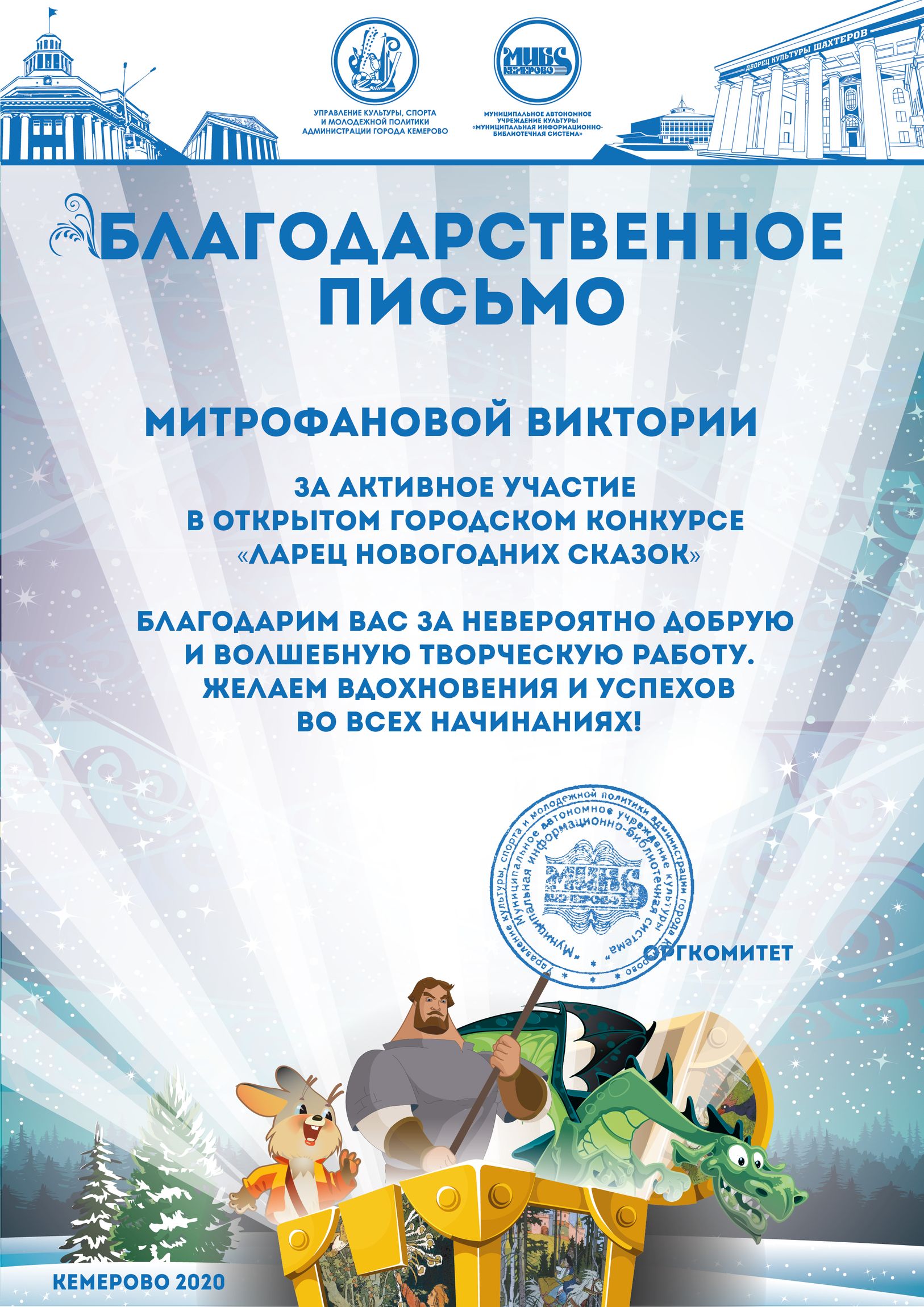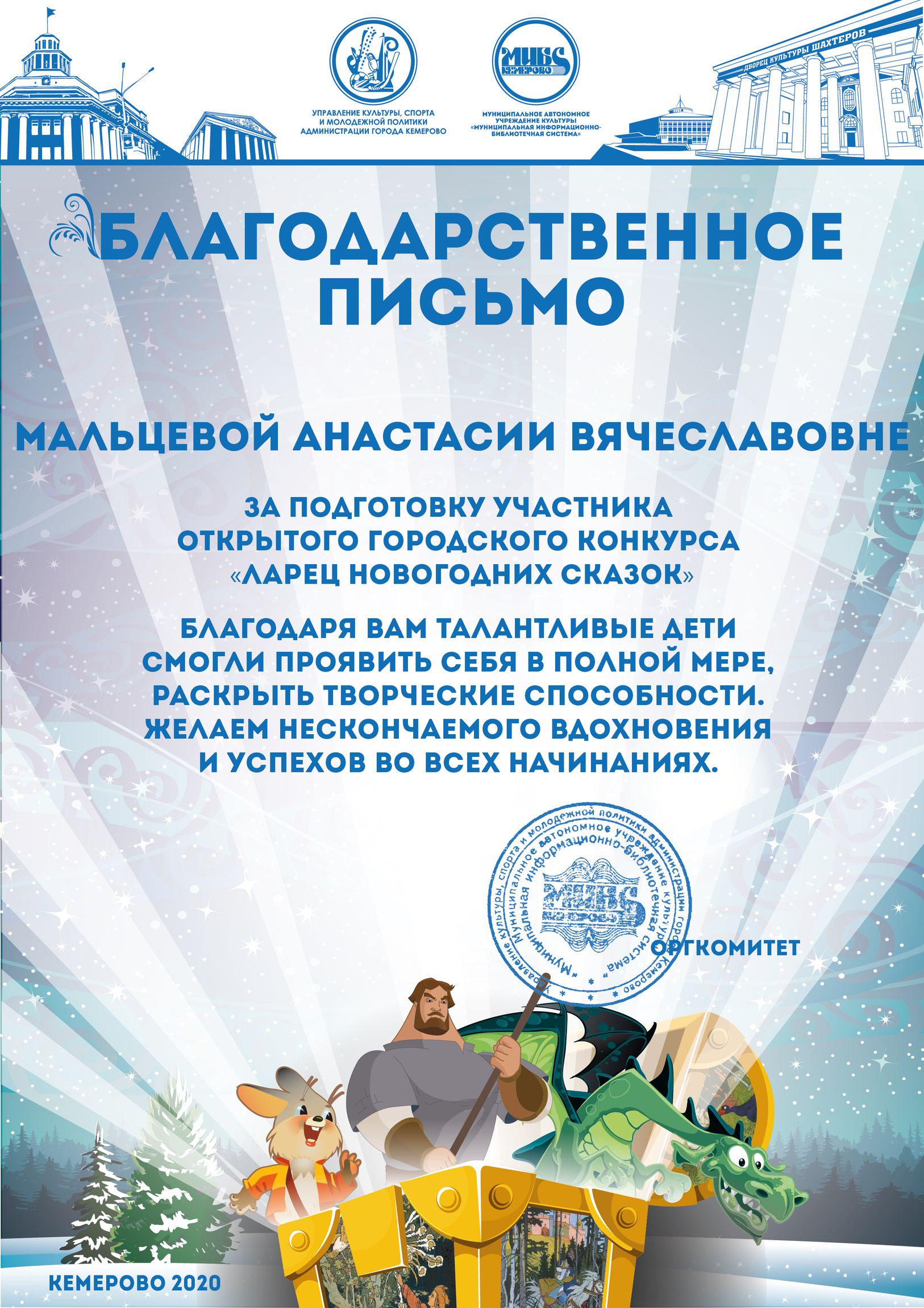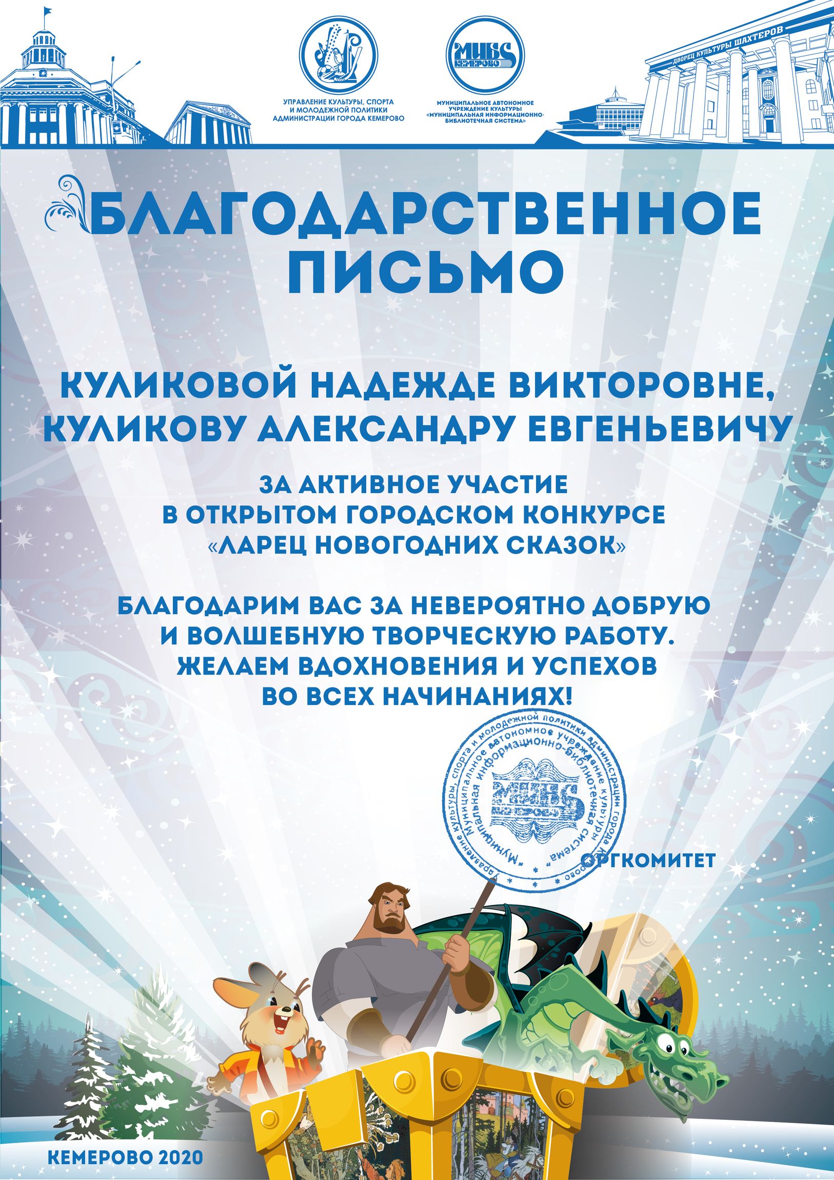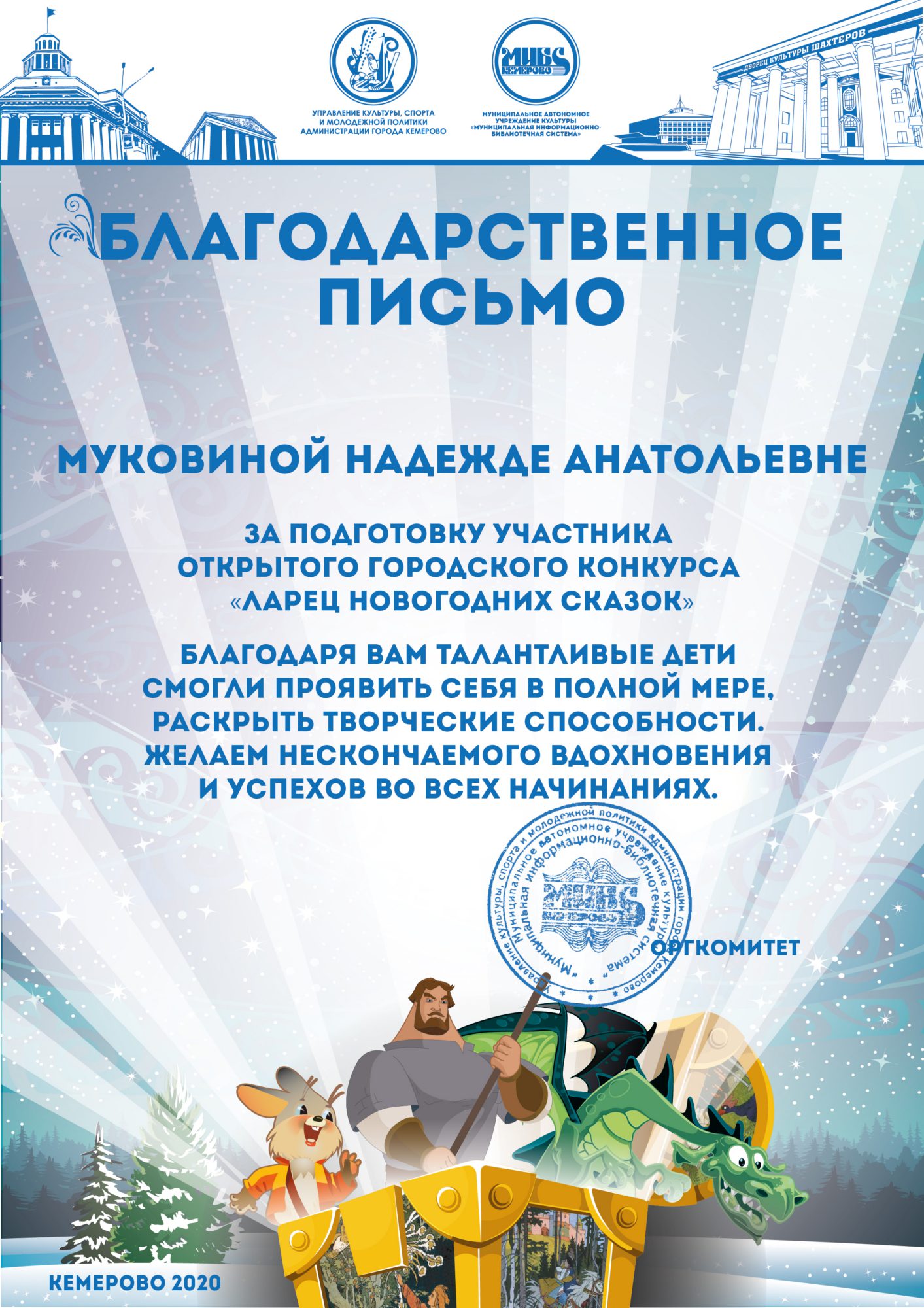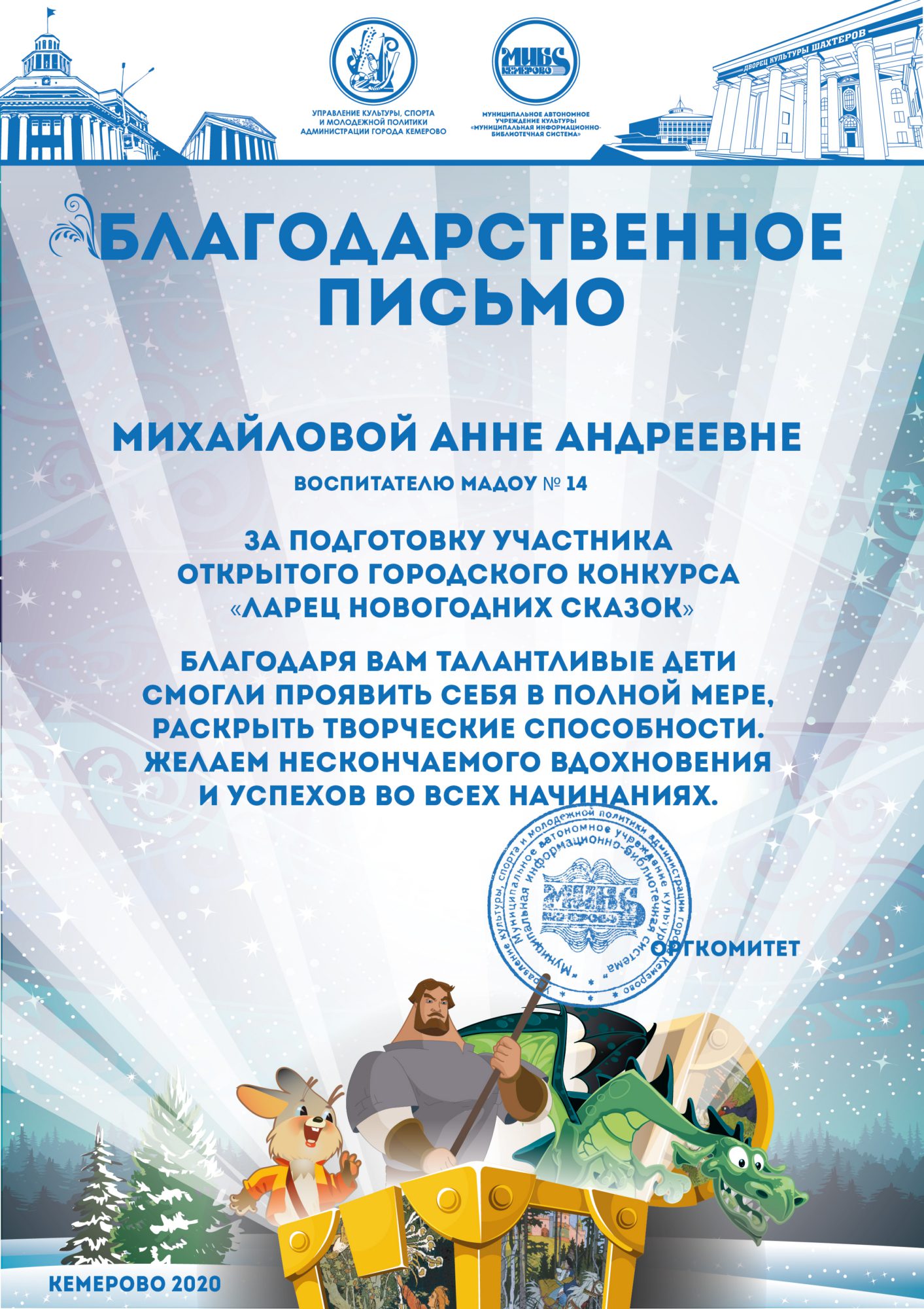 Пенькова Анна Константиновна, творческая работа «Сказ о том, откуда Кемеровоград пошел», «Сказка о том, как Дедушка Мороз с Вьюгой да Метелицей Новый год в городе Кемерове встречали»