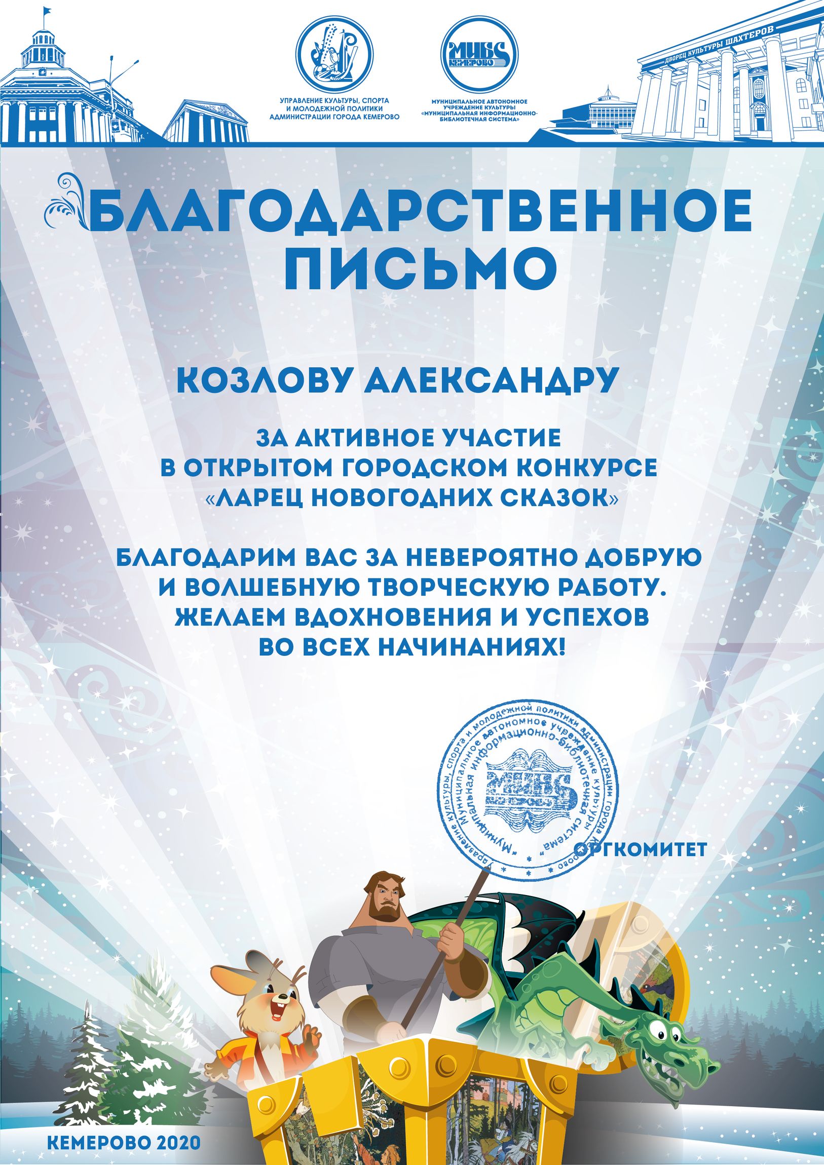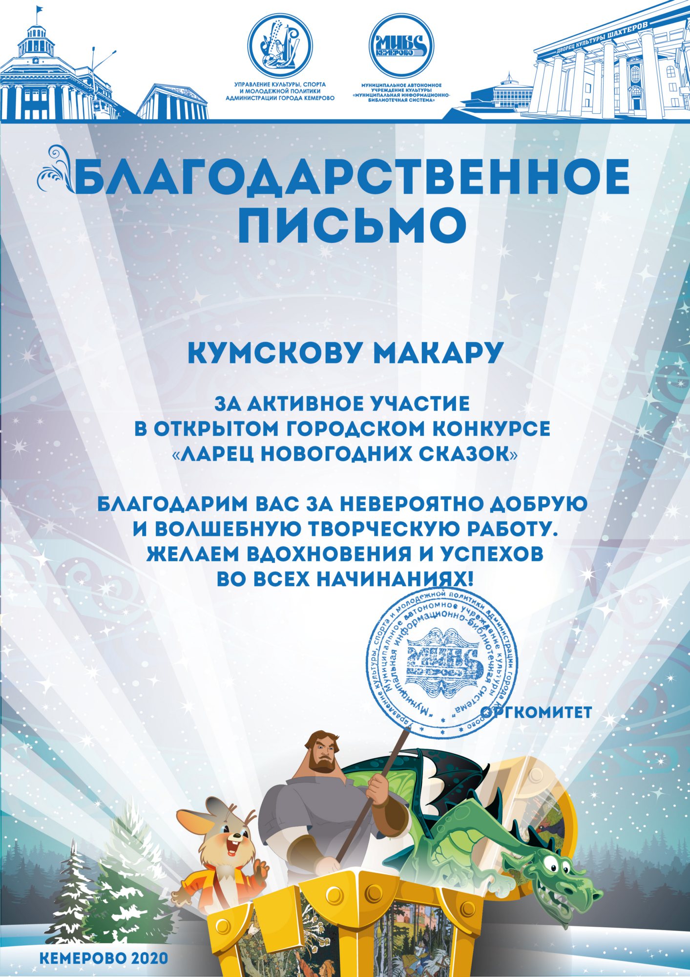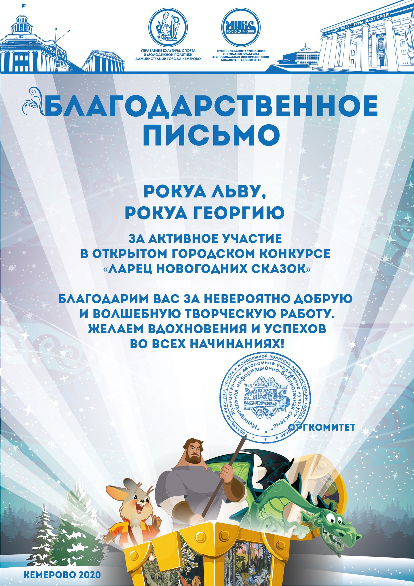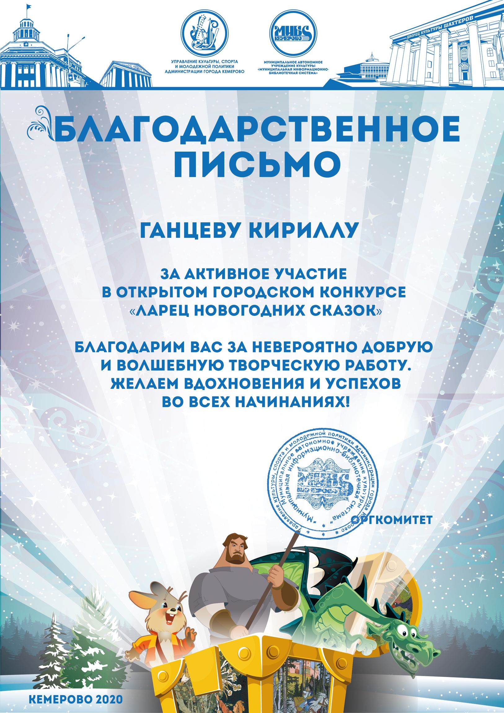 Пенькова Анна Константиновна, творческая работа «Сказ о том, откуда Кемеровоград пошел», «Сказка о том, как Дедушка Мороз с Вьюгой да Метелицей Новый год в городе Кемерове встречали»