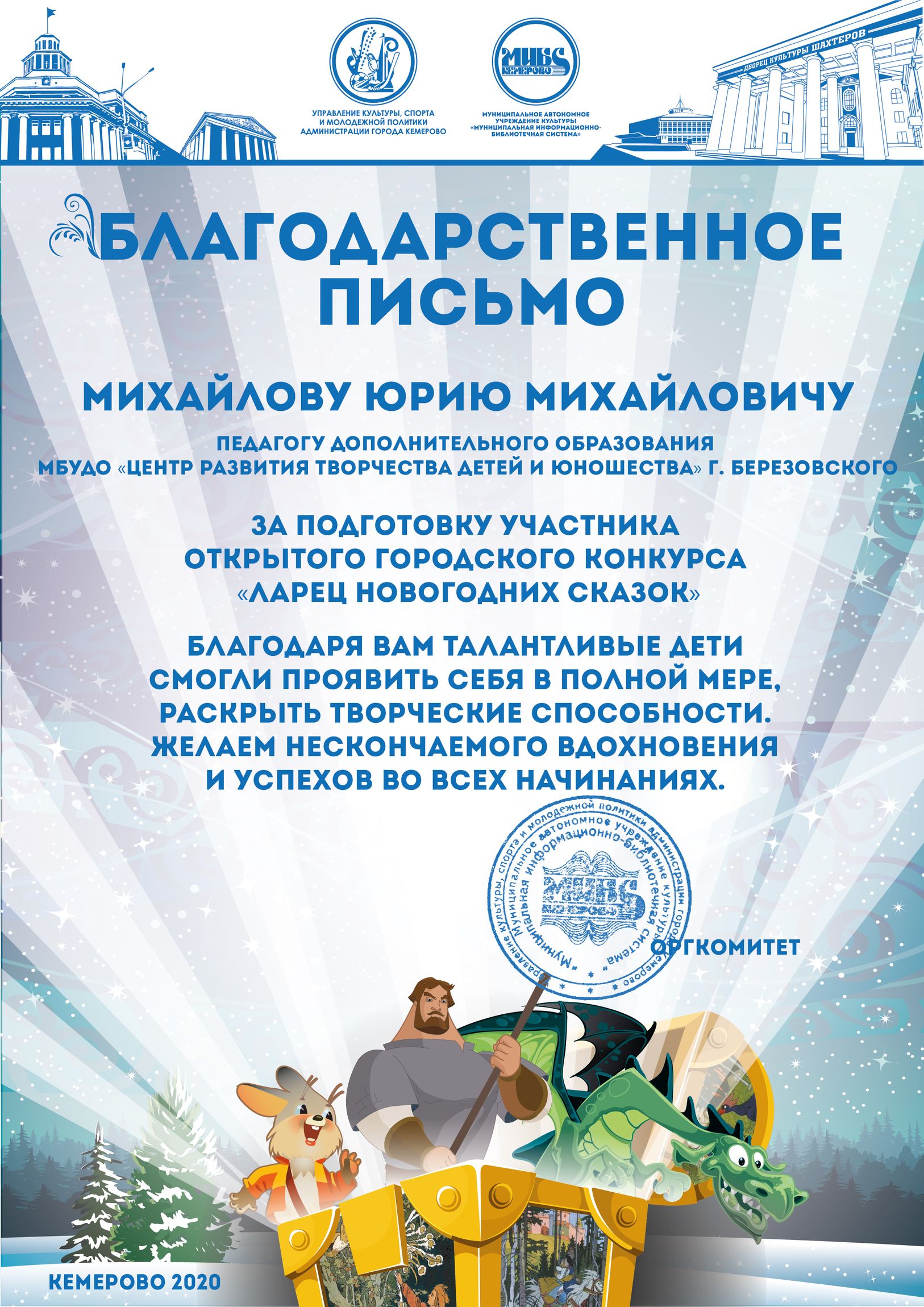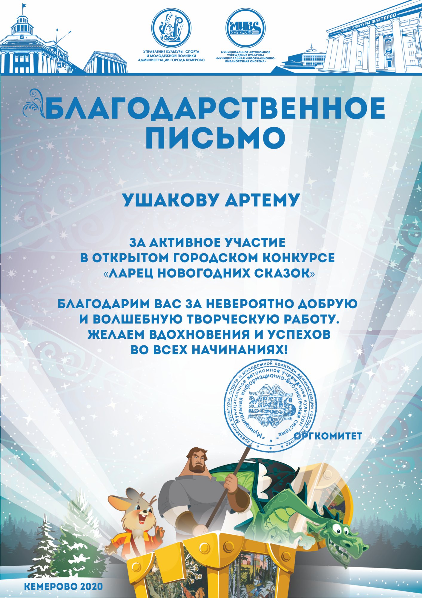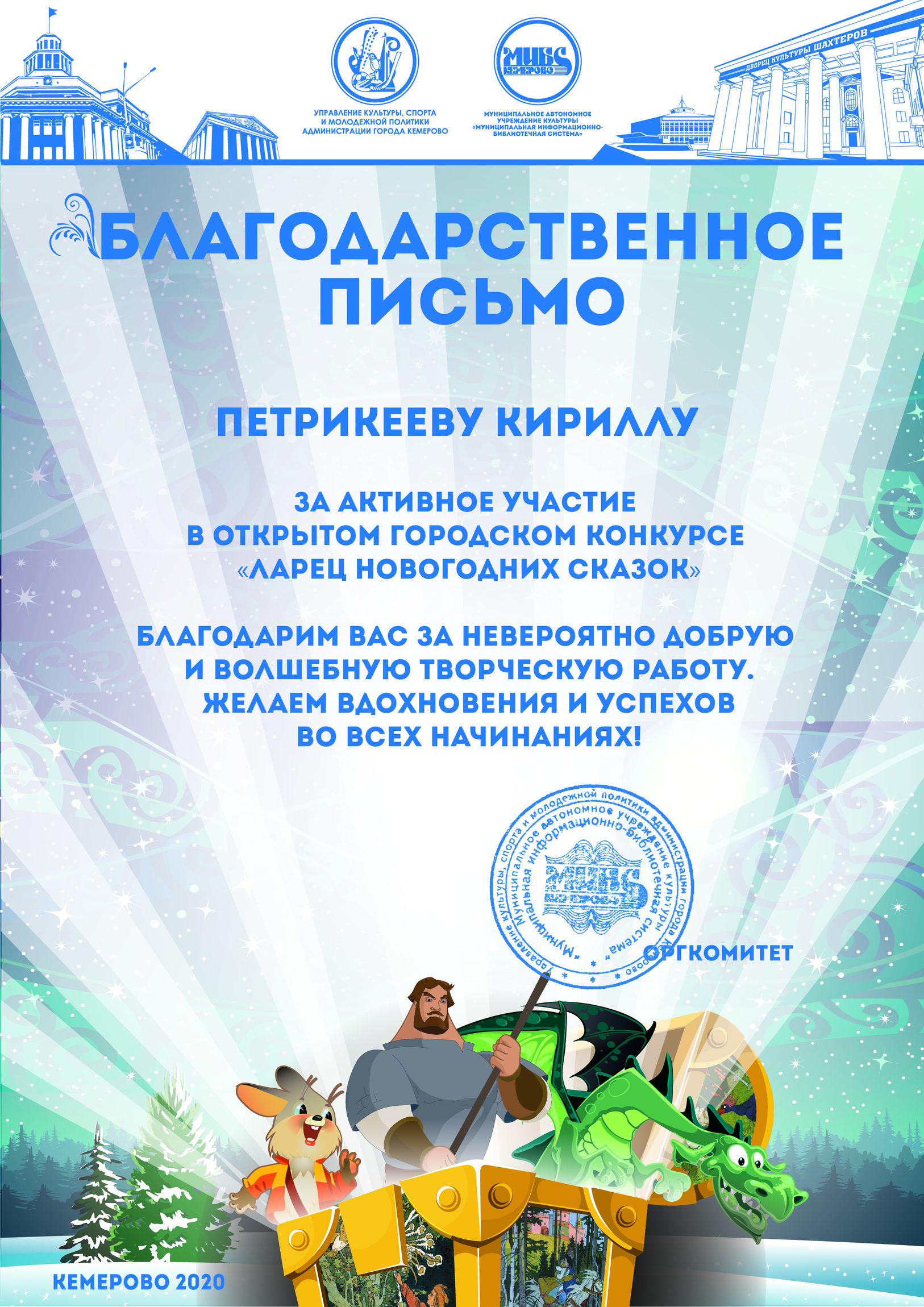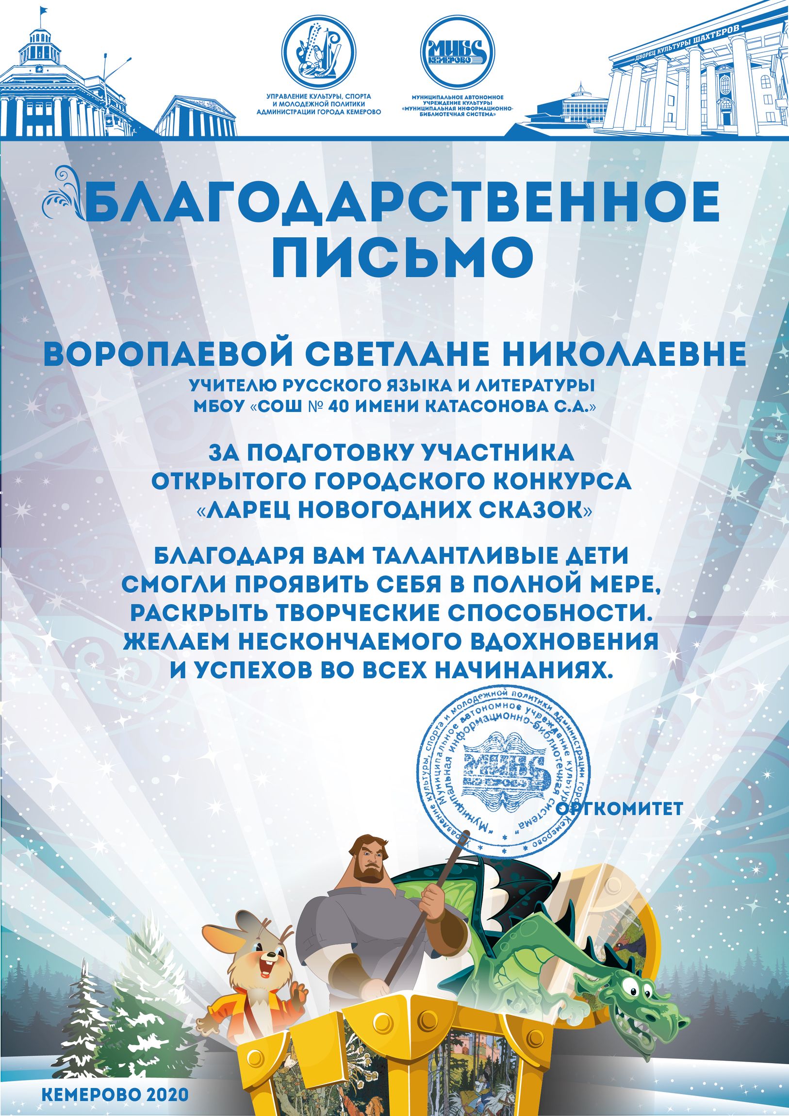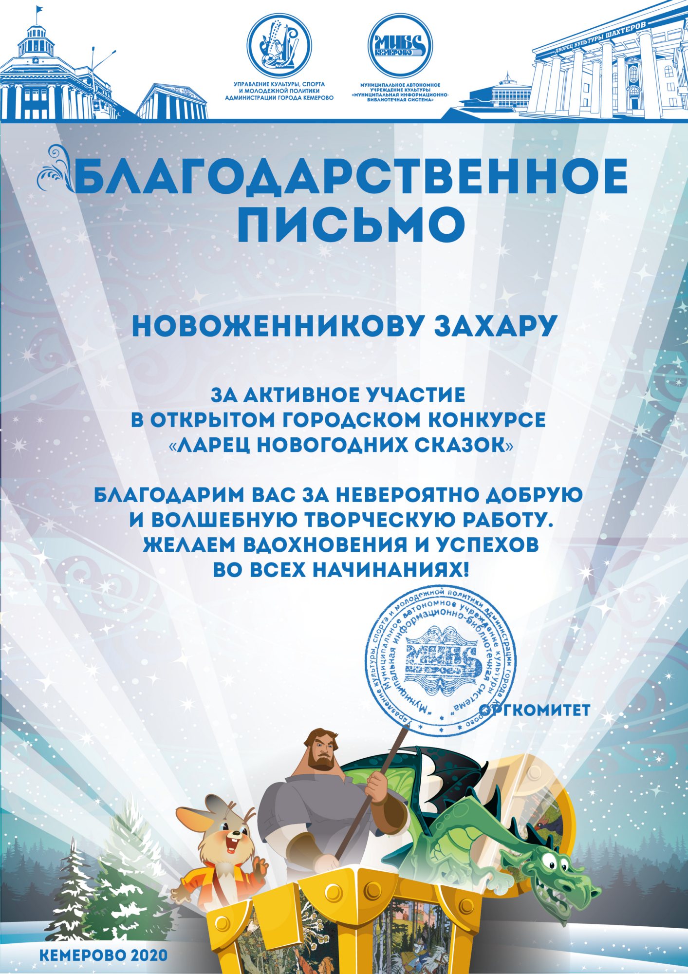 Пенькова Анна Константиновна, творческая работа «Сказ о том, откуда Кемеровоград пошел», «Сказка о том, как Дедушка Мороз с Вьюгой да Метелицей Новый год в городе Кемерове встречали»