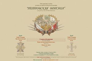 «Петровская бригада» таково историческое название двух первых полков русской гвардии Преображенского и Семеновского, созданных Петром Первым в конце XVII века. В наши дни «ПЕТРОВСКАЯ БРИГАДА» это объединение трех клубов военно-исторической реконструкции «Лейб-Гвардии Преображенский полк», «Лейб-Гвардии Семеновский полк» и «Лейб-Гвардии Егерский полк». Клубы воспроизводят обмундирование, снаряжение и вооружение полков российской императорской гвардии в период Отечественной войны 1812 года и Заграничных походов 1813-1814 гг. |