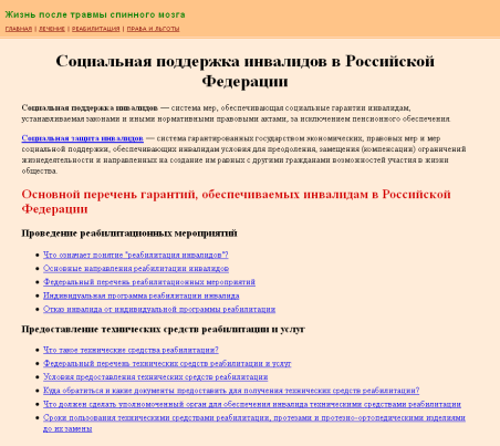 Вкус к жизниПутеводитель по электронным ресурсам социальной помощи людям с ограниченными возможностямиДорогой пользователь! Людям с ограниченными возможностями, как никому другому, важно идти в ногу со временем и не чувствовать себя оторванными от общества. Для многих из таких людей окном в активную жизнь становится Интернет. Это не только средство коммуникации в век современных технологий это самый верный и удобный способ самореализации для тех, кому затруднительны постоянные перемещения. Именно во Всемирной паутине эти люди могут найти возможности для образования и трудоустройства. Предлагаем вашему вниманию путеводитель по электронным ресурсам социальной помощи людям с ограниченными возможностями. На предложенных сайтах вы можете получить помощь в решении проблем по выходу из сложных ситуаций, знакомиться, дружить, общаться, делиться друг с другом новостями, правовой информацией, советами, которые помогут другим людям с ограниченными физическими возможностями интегрироваться в общество и жить полноценной жизнью. Информация, собранная в электронном путеводителе, представляет несомненный интерес для людей с ограниченными возможностями, их родственников, для тех, кто профессионально занимается проблемами реабилитации людей с ограниченными возможностями и тех, кто работает с этой категорией граждан. Социальная поддержка инвалидов в Российской Федерации