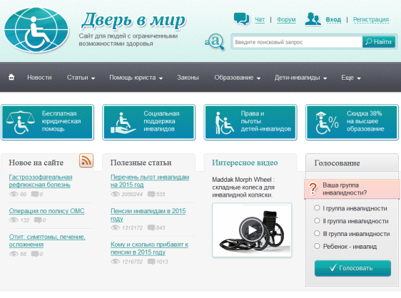 Инвалиды с нарушениями опорно-двигательного аппарата не имеют физической возможности выбраться на улицу и вынуждены проводить все свое время в четырех стенах. Поэтому на основе использования коммуникационных инструментов сети Интернет информация на сайте способствует социальной адаптации, получению профессионального образования, трудоустройству, самореализации людей с ограниченными возможностями здоровья. Здесь можно получить бесплатную юридическую помощь, узнать про дистанционное обучение, найти нужную и полезную информацию. Юристы сайта для инвалидов помогут вам защитить ваши права и социальные гарантии. Адрес сайта: doorinworld.ru Портал Inva-life.ru