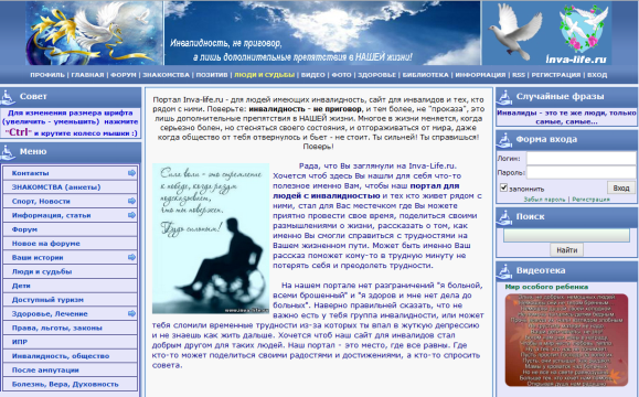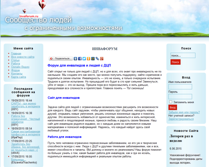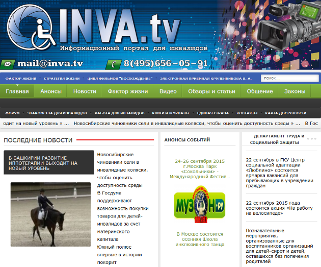 Задача сайта для людей с ограниченными возможностями расширить эти возможности для каждого. Этот сайт задуман, чтобы увели-чивать круг общения, находить новых друзей, открывать новые увлечения, решать сложные жизненные задачи и помогать другим. Это возможность избавиться от одиночества, измениться и жить интересной, наполненной и плодотворной жизнью, принося любовь и радость своим близким. Сайт для инвалидов родился недавно, но с каждым днем он наполняется новыми материалами и полезной информацией. Каждый найдет здесь свой любимый уголок. Адрес сайта: invaforum.ru Информационный портал для инвалидов Inva.tv