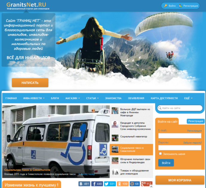 Сайт «Границ Нет» представляет собой блогосоциальную сеть сайт для инвалидов, инвалидов-колясочников и маломобильных людей, пенсионеров, где каждый может высказать свое мнение и быть услышанным. Это сайт для инвалидов, ко-торые хотят изменить не только свою жизнь, но и понимание инвалидности в нашем обществе. На сайте можно общаться, высказывать свое особое мнение. В разделе «Знакомства» вам помогут найти вторую половинку, создать свою семью. Но если у Вас нет инвалидности, этот сайт все равно для Вас. Ведь для общения не важно, какая «группа» у человека. Адрес сайта: granitsnet.ru Сообщество людей с ограниченными возможностями