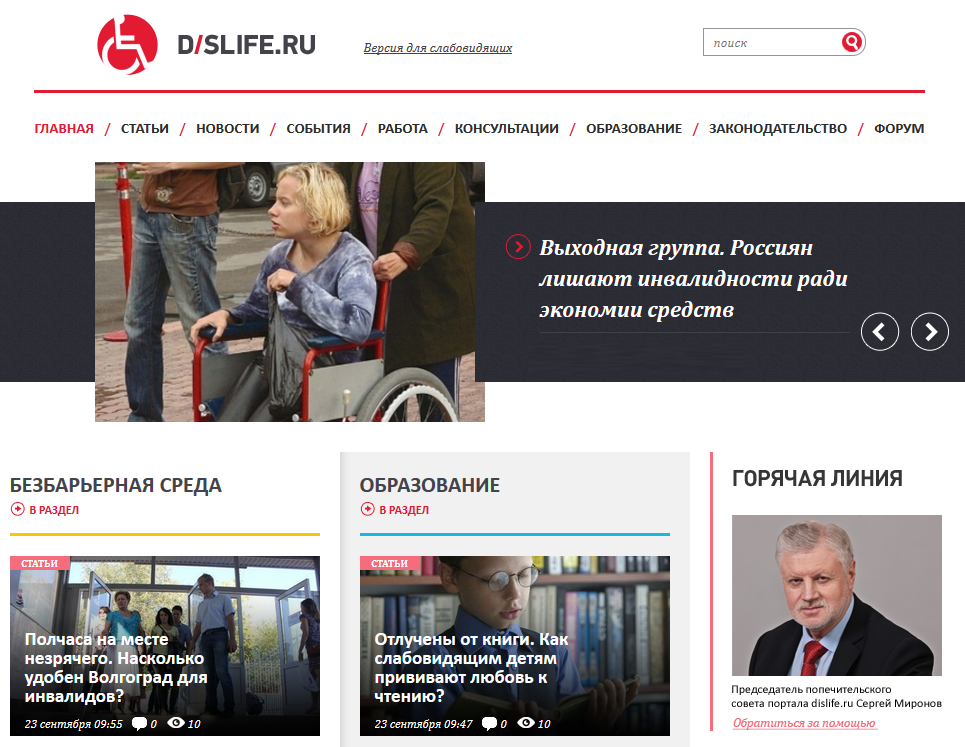 На портале вы можете познакомиться с текущими новостями и анонсами предстоящих мероприятий. Посмотреть подборку интересных телевизионных передач, документальных фильмов и другого интересного видео. На портале размещено много полезной информации о трудоустройстве и образовательных курсах; здесь есть масса статей, книг и журналов в электронной форме. Вы сможете ознакомиться с ответами на часто задаваемые вопросы о льготах для инвалидов, обеспечению людей с ограниченными возможностями средствами реабилитации и техническими приспособлениями. На форуме портала вы найдете площадку для интересного общения и обмена информацией, приобретете новых друзей. Адрес сайта: inva.tv/ Портал Dislife.ru