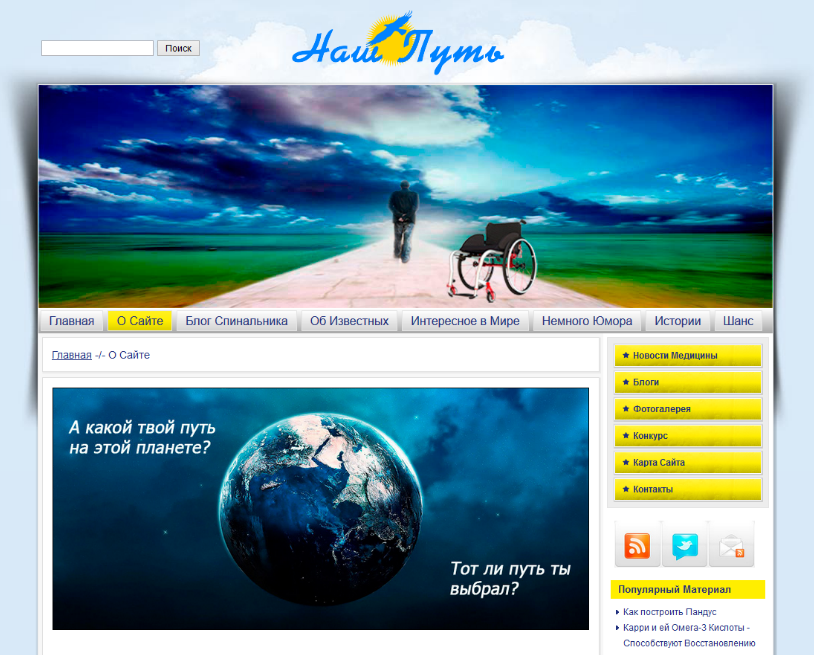 У каждого из нас есть свой путь от рождения и до смерти. Этот путь дан нам свыше, и мы обязаны пройти его до конца. Сайт поможет вам в том, чтоб пройти свой нелегкий жизненный путь с высоко поднятой головой, независимо от тех неудач и трудностей, которые выпадут и встретятся на этом пути. Еще этот сайт о знаменитых и обычных людях, живущих среди нас с вами. О людях, которые, несмотря на все сложности, выпавшие на их жизненный путь, не опустили рук и продолжают идти по своему пути сквозь трудности, боль, непонимание и безразличие со стороны таких же людей. Данный сайт создан и наполняется человеком с травмой спинного мозга (С6-С7), у которого не работают пальцы рук, и все, что вы видите, сделано при помощи карандаша, примотанного к пальцам рук, и огромного желания. Адрес сайта: nashput.com | |||||||||||||||||||||