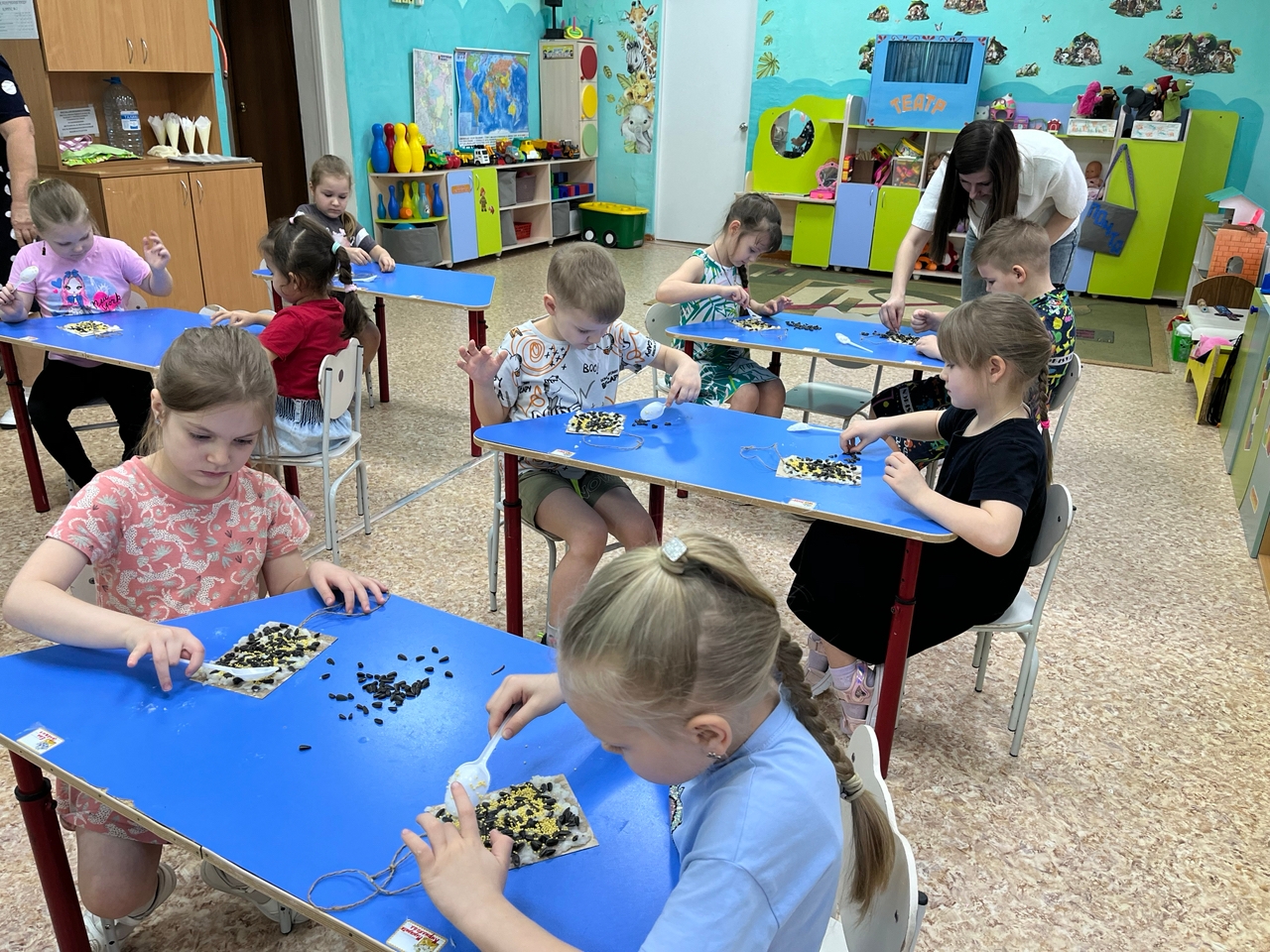 Готовые изделия размещены на деревьях, расположенных на территории детского сада, что обеспечит возможность регулярного наблюдения за птицами и их подкормки в зимний период.