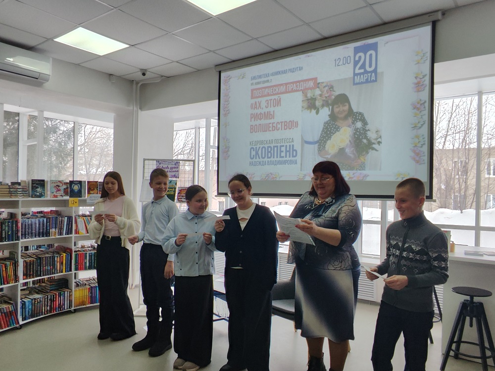 20 марта 2026 года в библиотеке семейного чтения «Книжная радуга» (ул. Новогодняя, 2) состоялся поэтический праздник «Ах, этой рифмы волшебство», приуроченный к Всемирному дню поэзии, участниками которого стали учащиеся средних классов МБОУ «СОШ № 96».